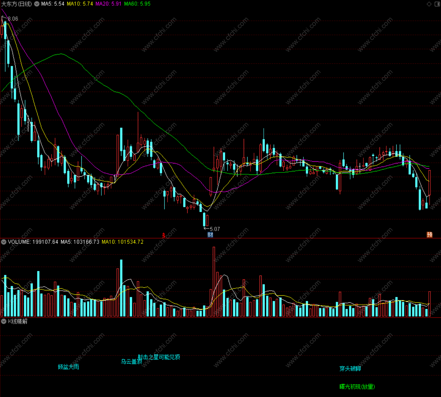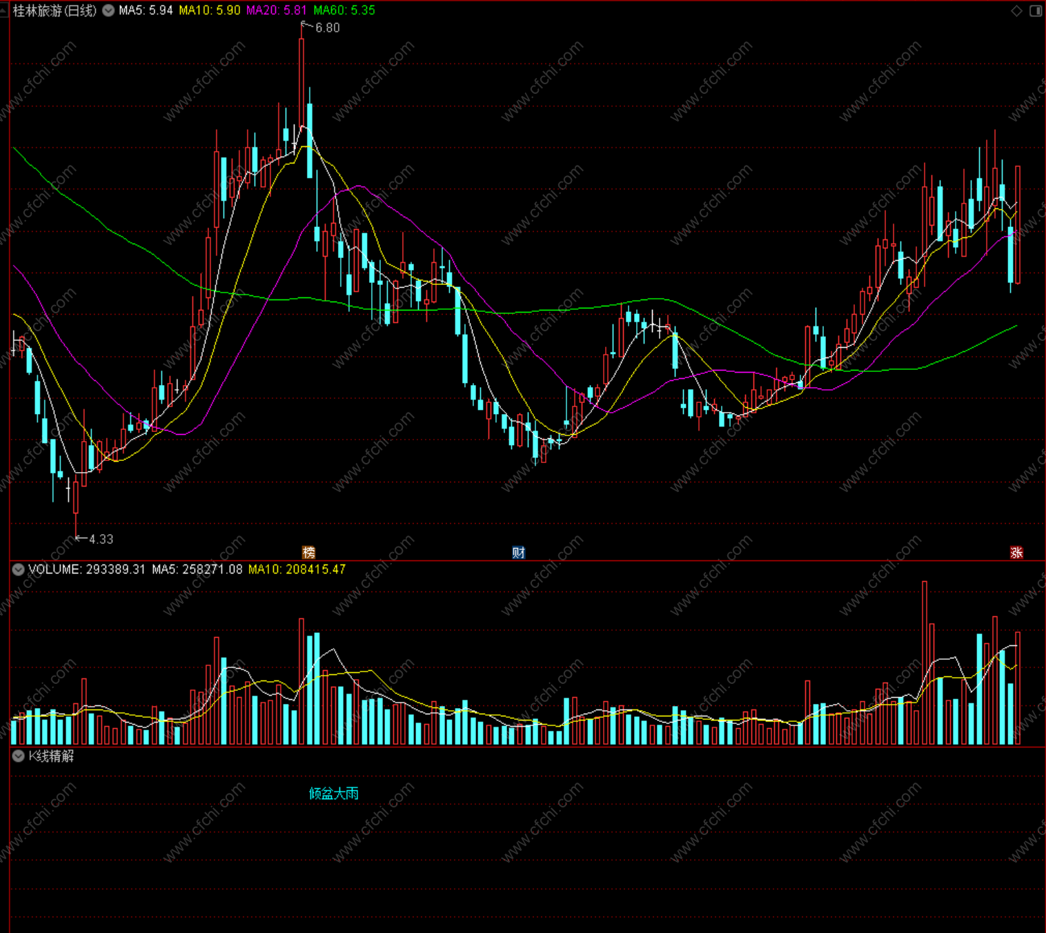 k线精解指标,含十字星,乌云盖顶,等众多指标提示,提供大家参考。股市有风险,入市需谨慎!!!