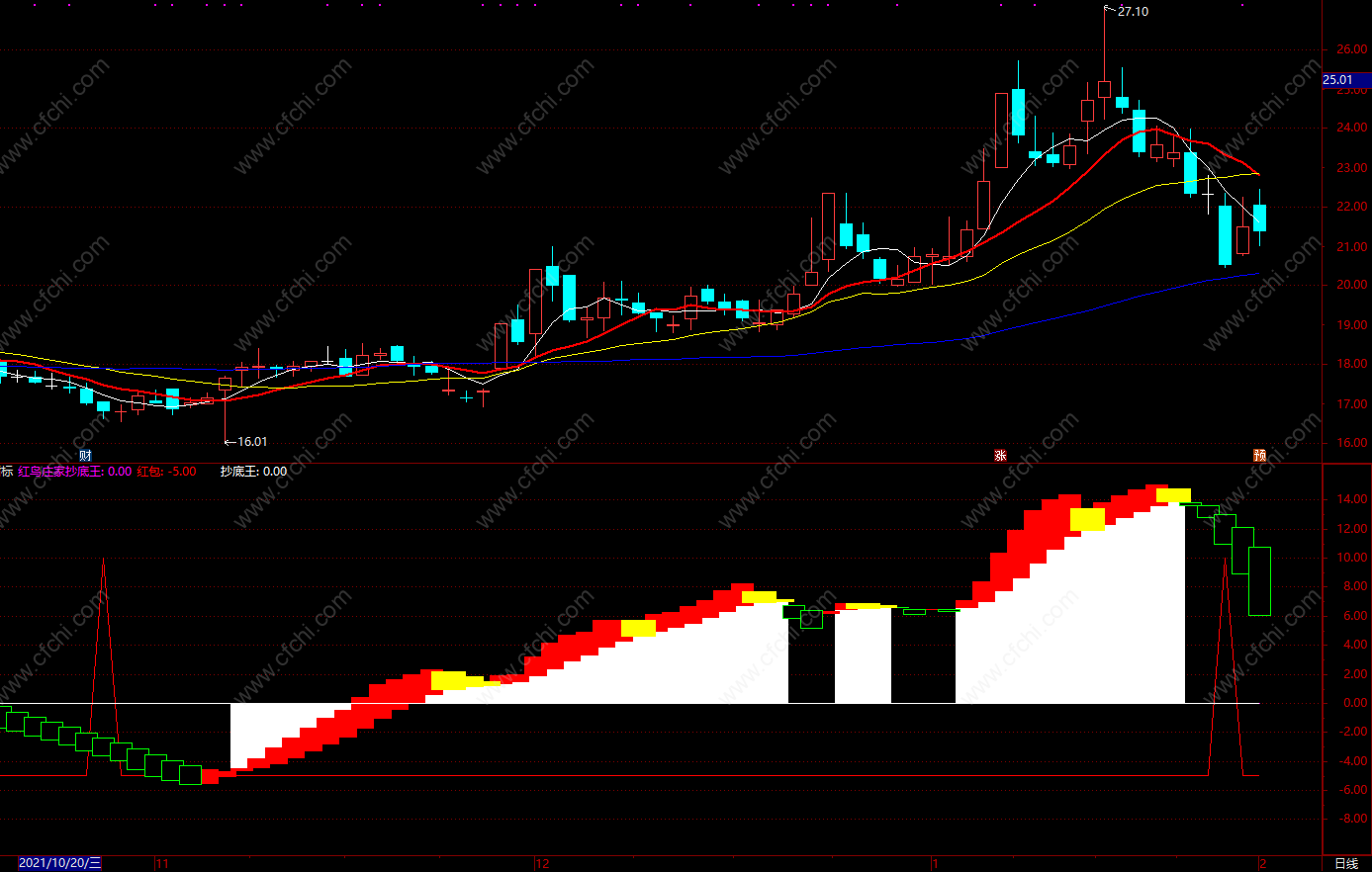 选股1:=-26;抄底:=-40;红鸟庄家抄底王:0,COLORFF00FF,POINTDOT;