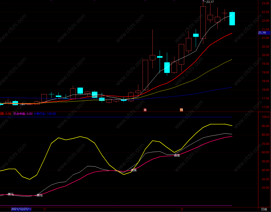 大势已去:IF(CROSS(黑马线,A1)AND 黑马线>70 AND 趋势线>80,90,100),COLORFF0000;