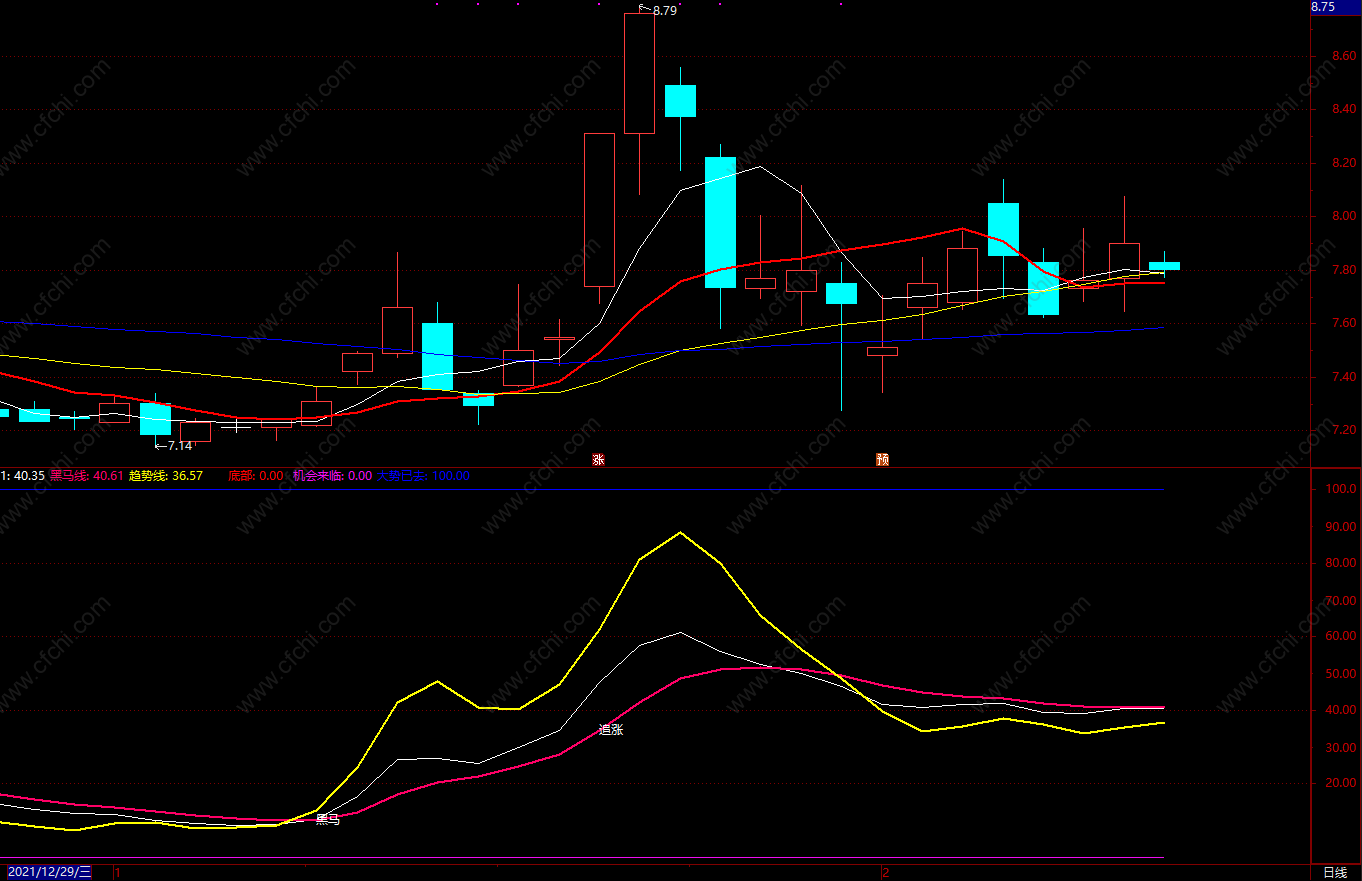DRAWTEXT(CROSS(黑马线,A5)AND 趋势线<80,黑马线,'追涨');