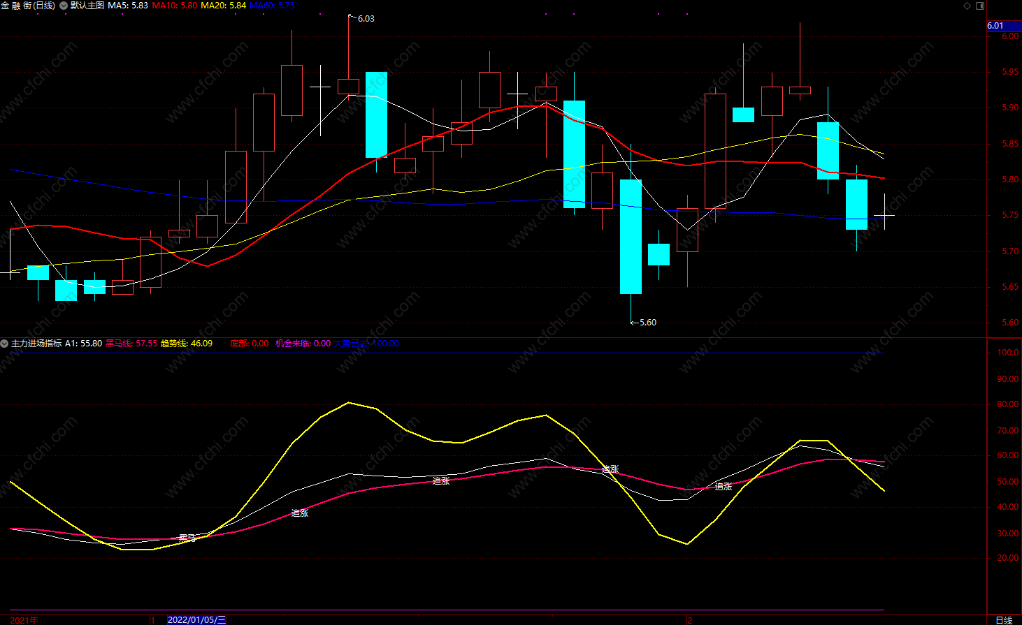 黑马线:EMA(A1,5),LINETHICK2,COLOR6600FF;