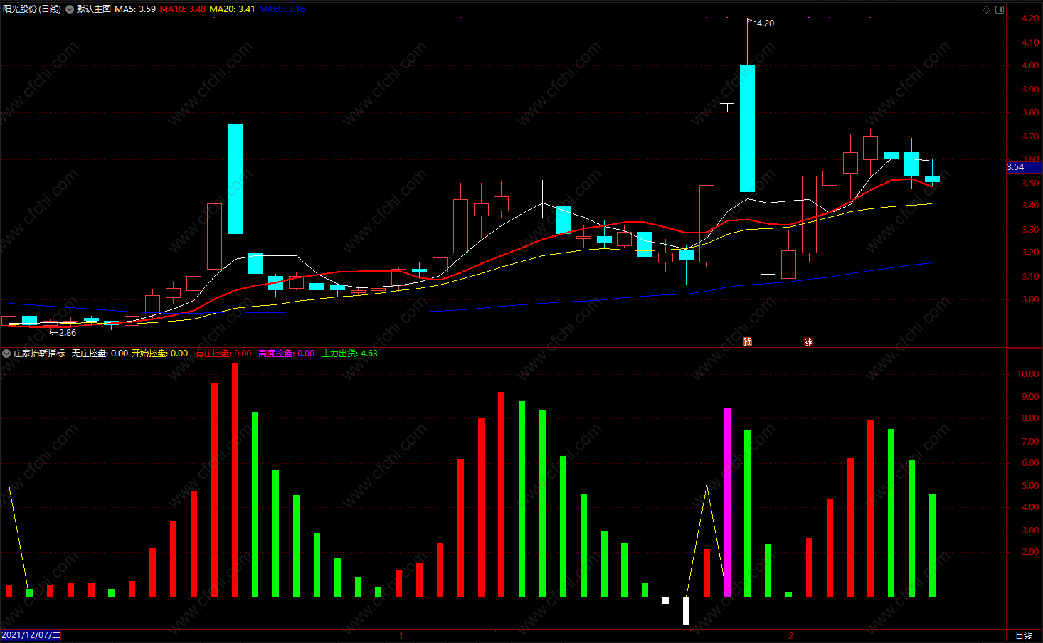 有庄控盘:IF(控盘>REF(控盘,1) AND 控盘>0,控盘,0),colorred,NODRAW;