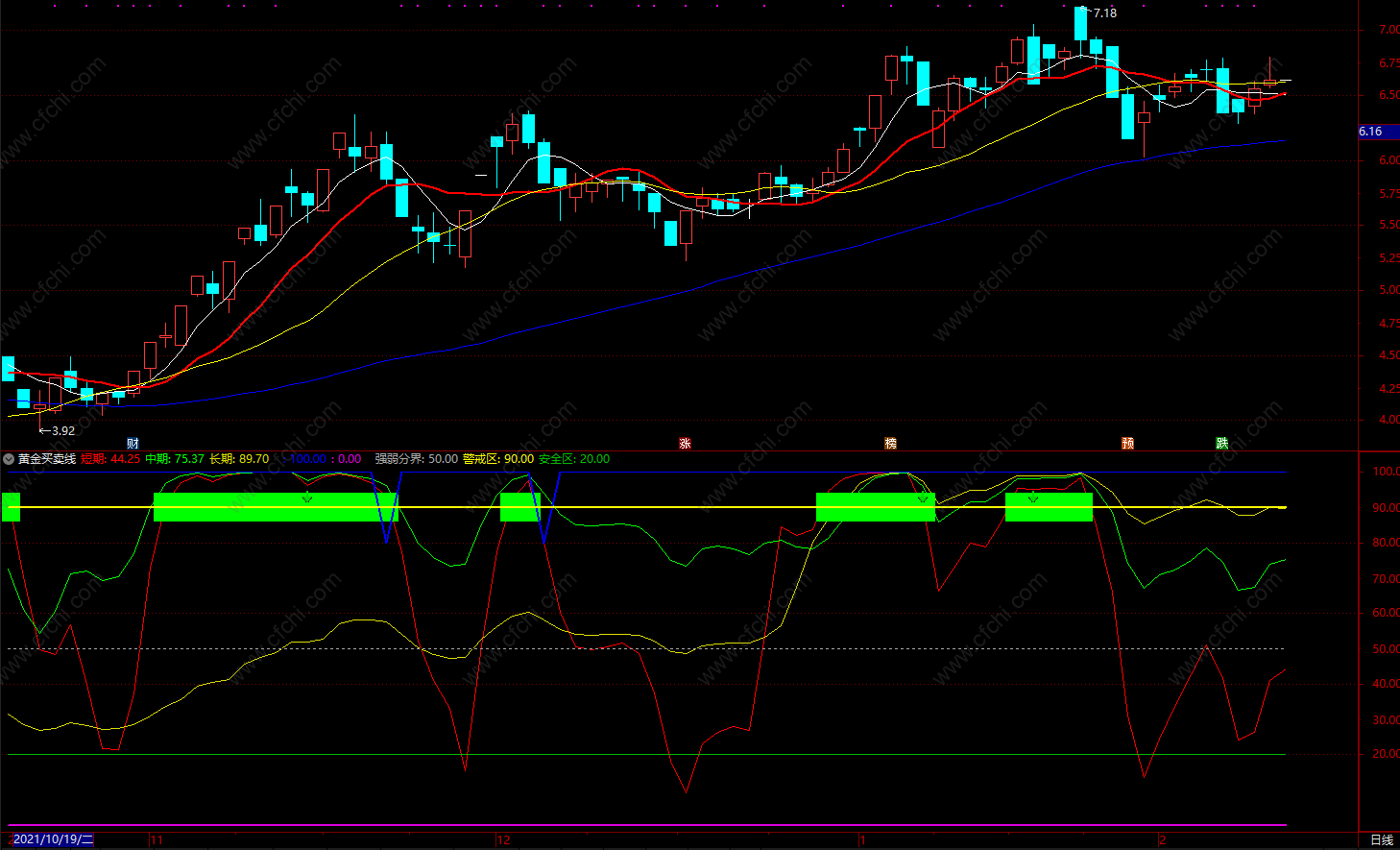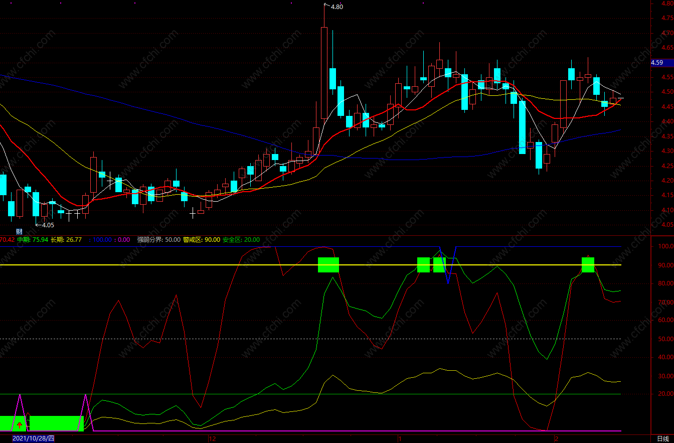 STICKLINE(短期>90 AND 中期>70,86,94,6,0),COLOR00FF00;