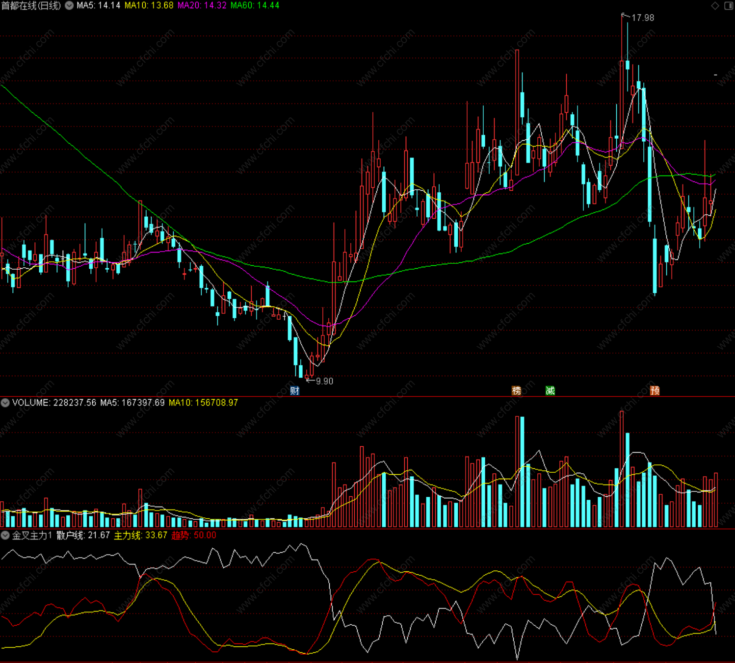 图中标示三条线,分别是散户线、主力线、趋势线。