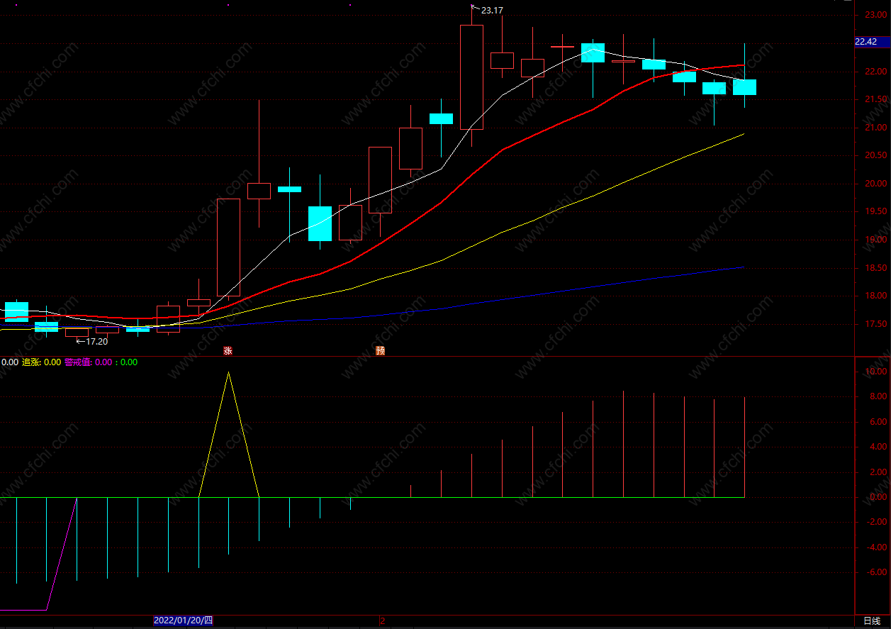图中所示副图指标中,凸起了一个尖尖的线条,这就是短线绝佳买入点指标,预示着这个股票上涨的趋势,这个时候买入,可能会赚得更多!