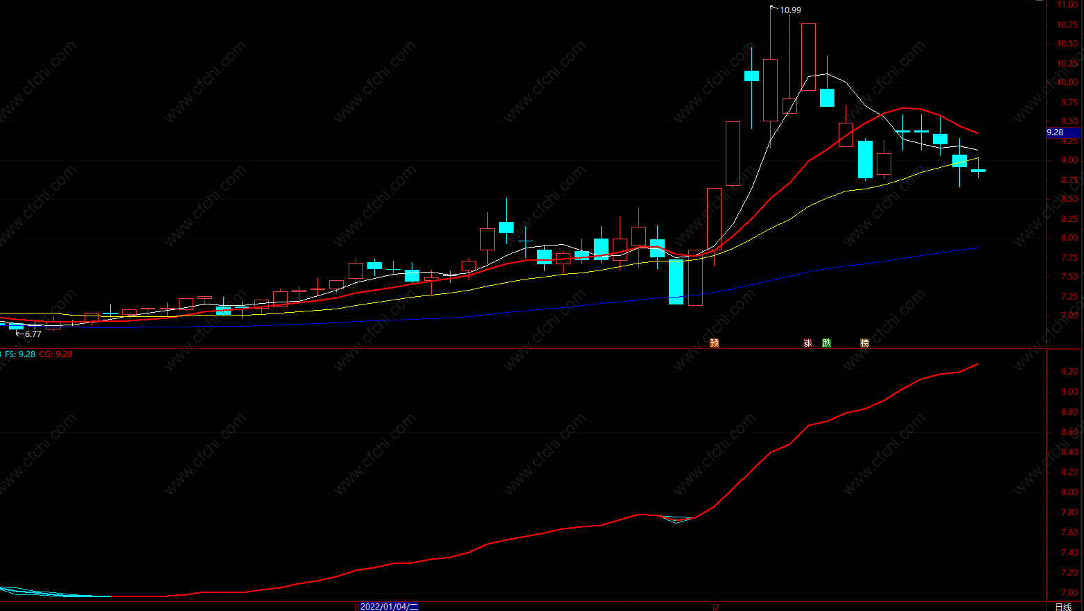 CG:IF(MA(CLOSE,17)<FS,FS,MA(CLOSE,17)),COLORRED,LINETHICK2;