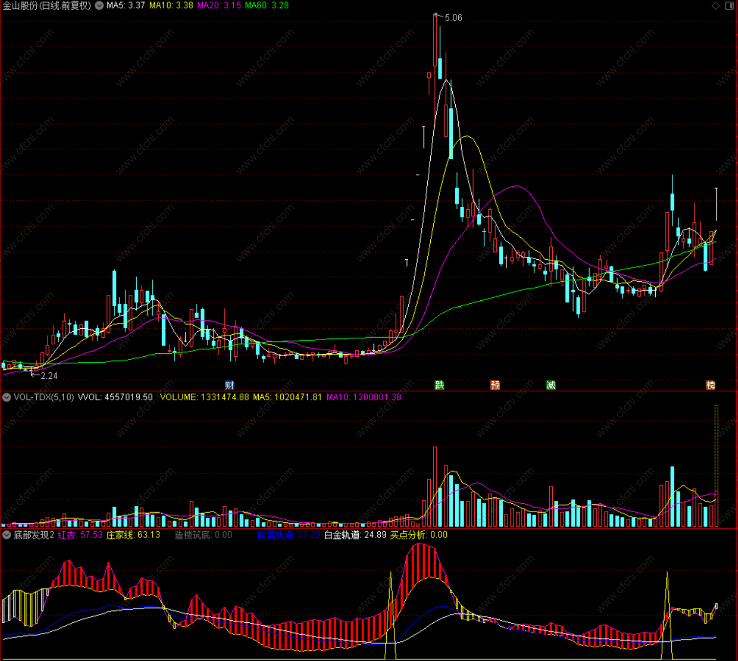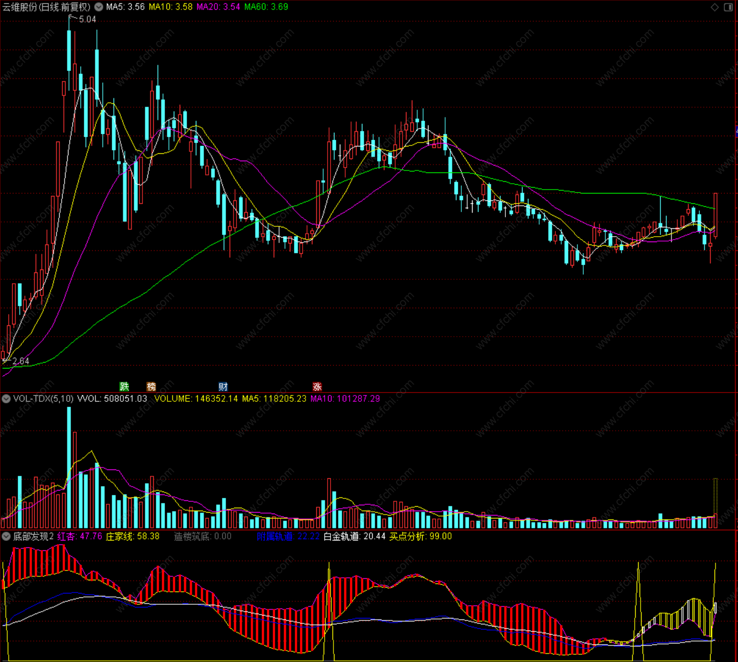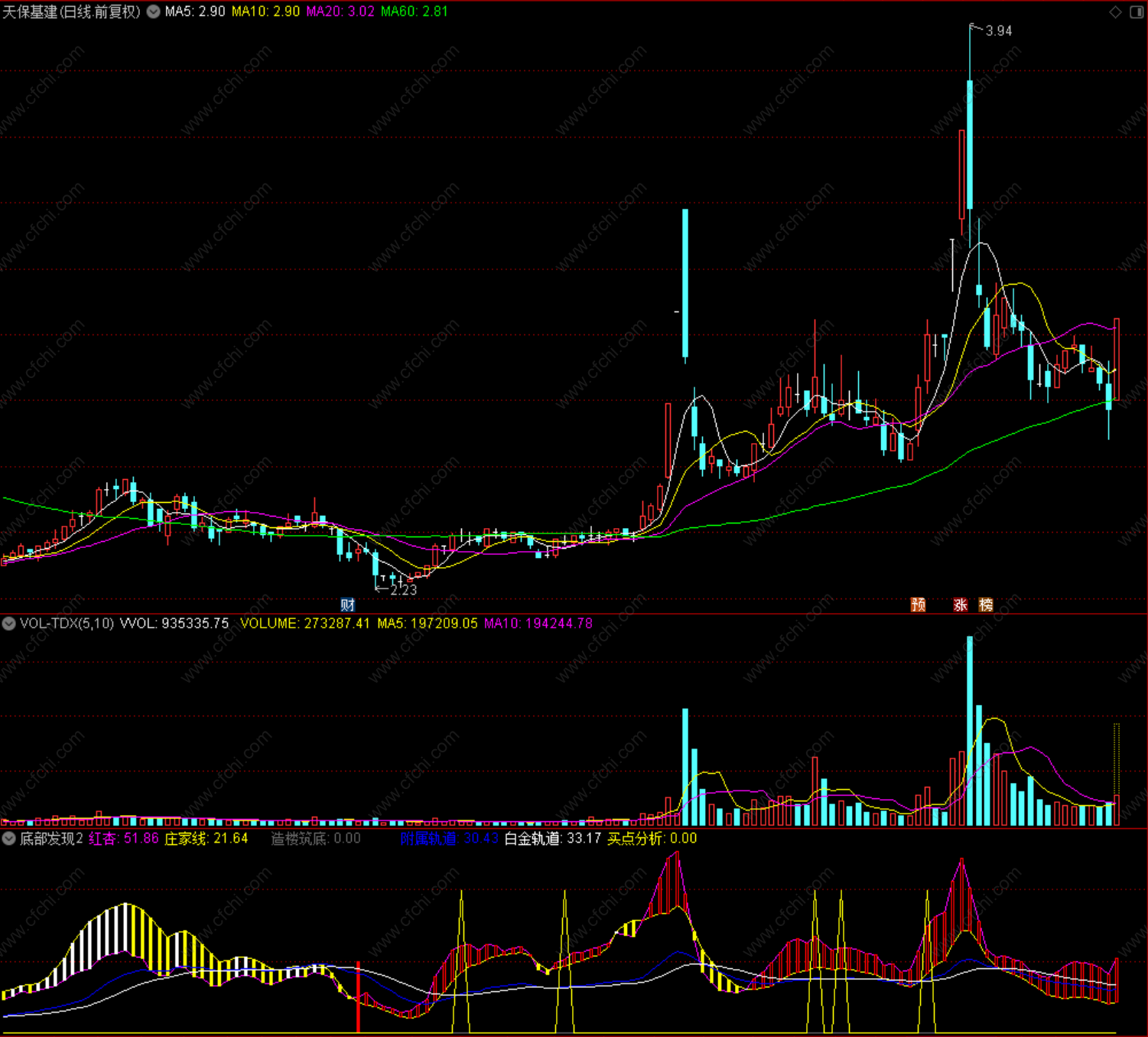 指标图形出现黄色塔尖符号为底部信号,白线、粉线、黄线三线金叉于一点为最佳买入机会,后势上涨概率较大。