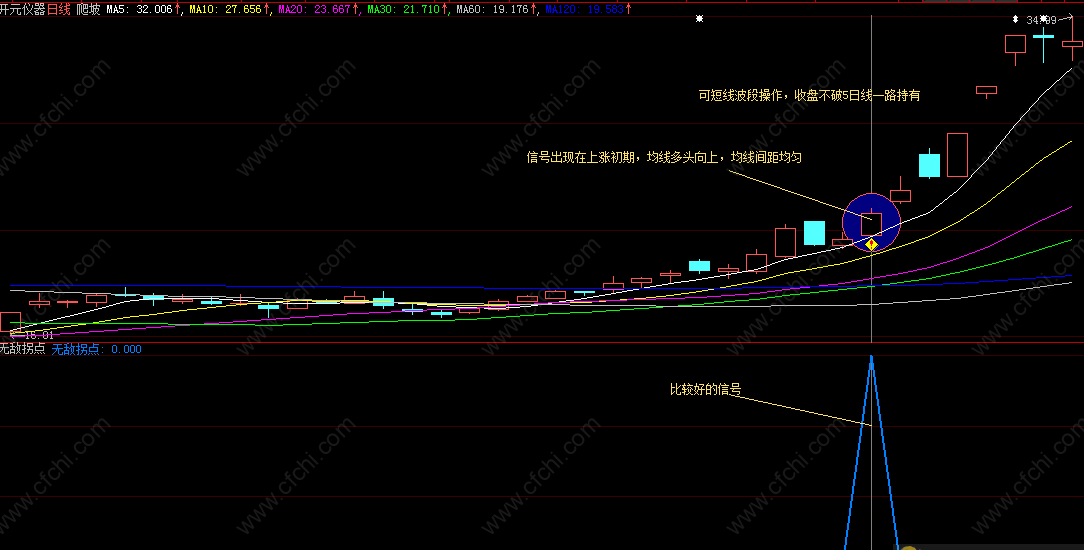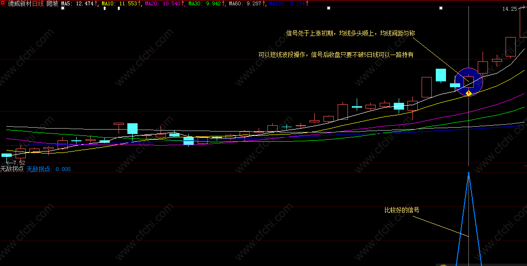 1、信号出现在上涨初期或上涨中途,各均线多头向上,平缓上升中,均线比较流畅,各均线之间的间距比较均匀的,没有特大特小的间距。