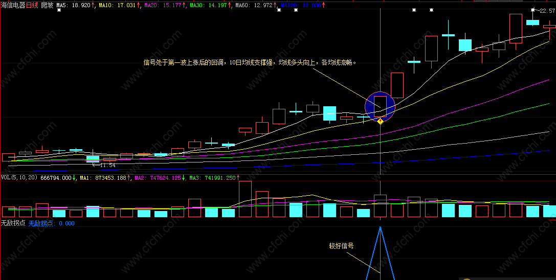 2、信号出现在第一波上涨后的回调,前波段涨幅不大的,信号当天K线下有均线强支撑的或股价回调后再次同时上穿5日和10日均线的,
