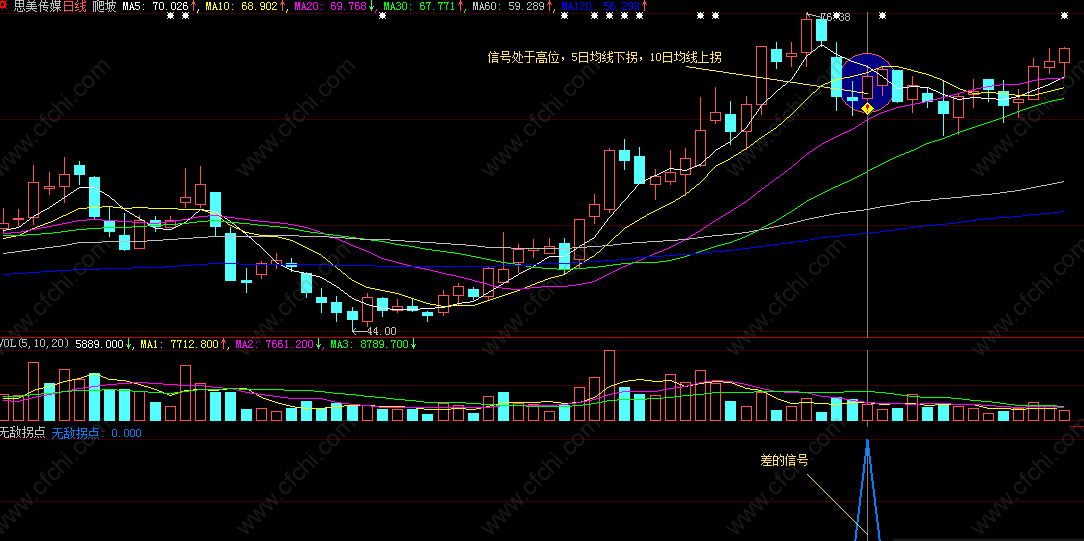 2、出信号K线处于高位的,5日均线下拐,10日均线上拐,2均线接近交叉的。