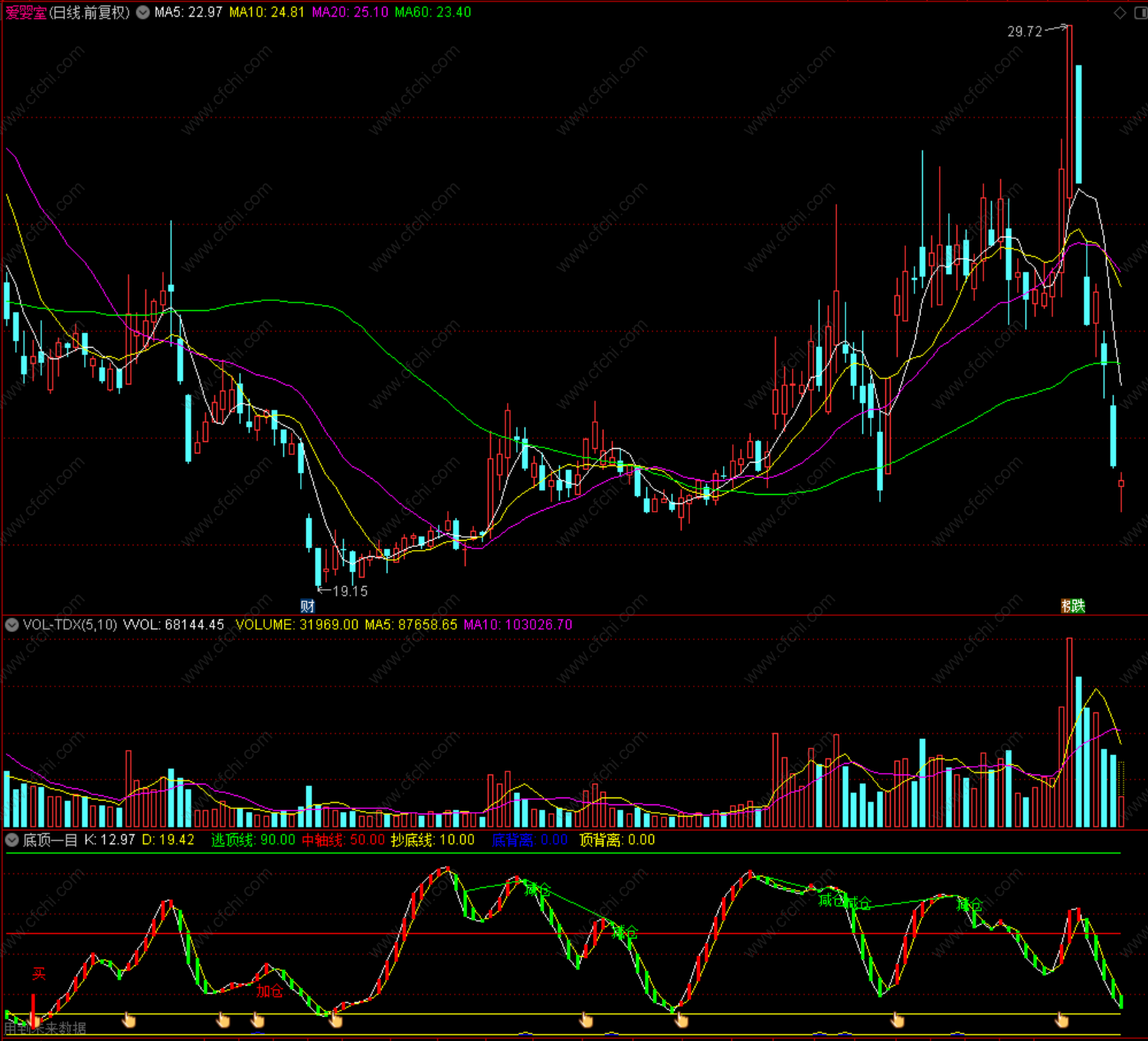 DRAWTEXT(顶背离>0,D-5,'减仓'),COLORGREEN;