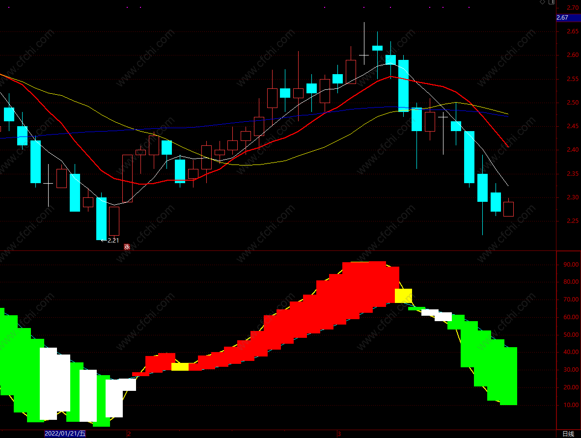 指标由两部分组成:黄色曲线代表个股中机构资金作多与做空的趋势和力度,向上为买入趋势,向下为卖出趋势,另一部分由红绿柱状线组成,代表机构持仓与增减仓的状态.黄色资金趋势向下未跌破柱状的机构持仓线时为机构短线洗盘,黄色机构资金趋势线向下跌破机构持仓线,并使持仓线翻绿,表示机构大力卖出,为不宜操作区域.