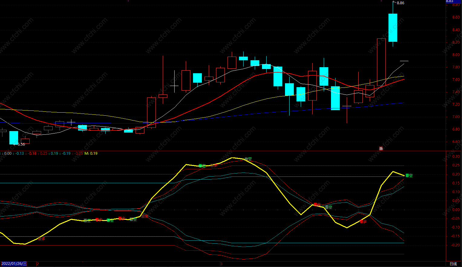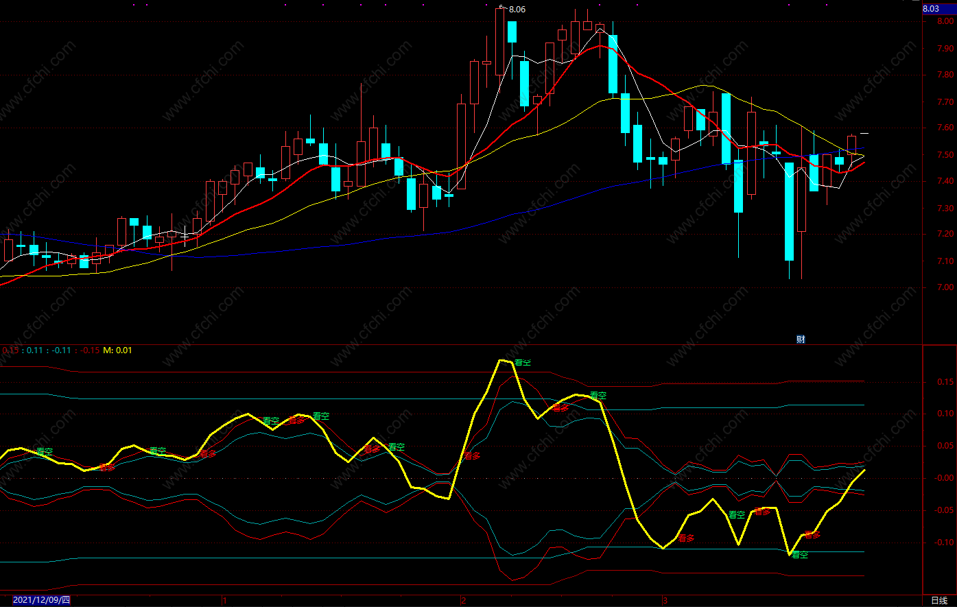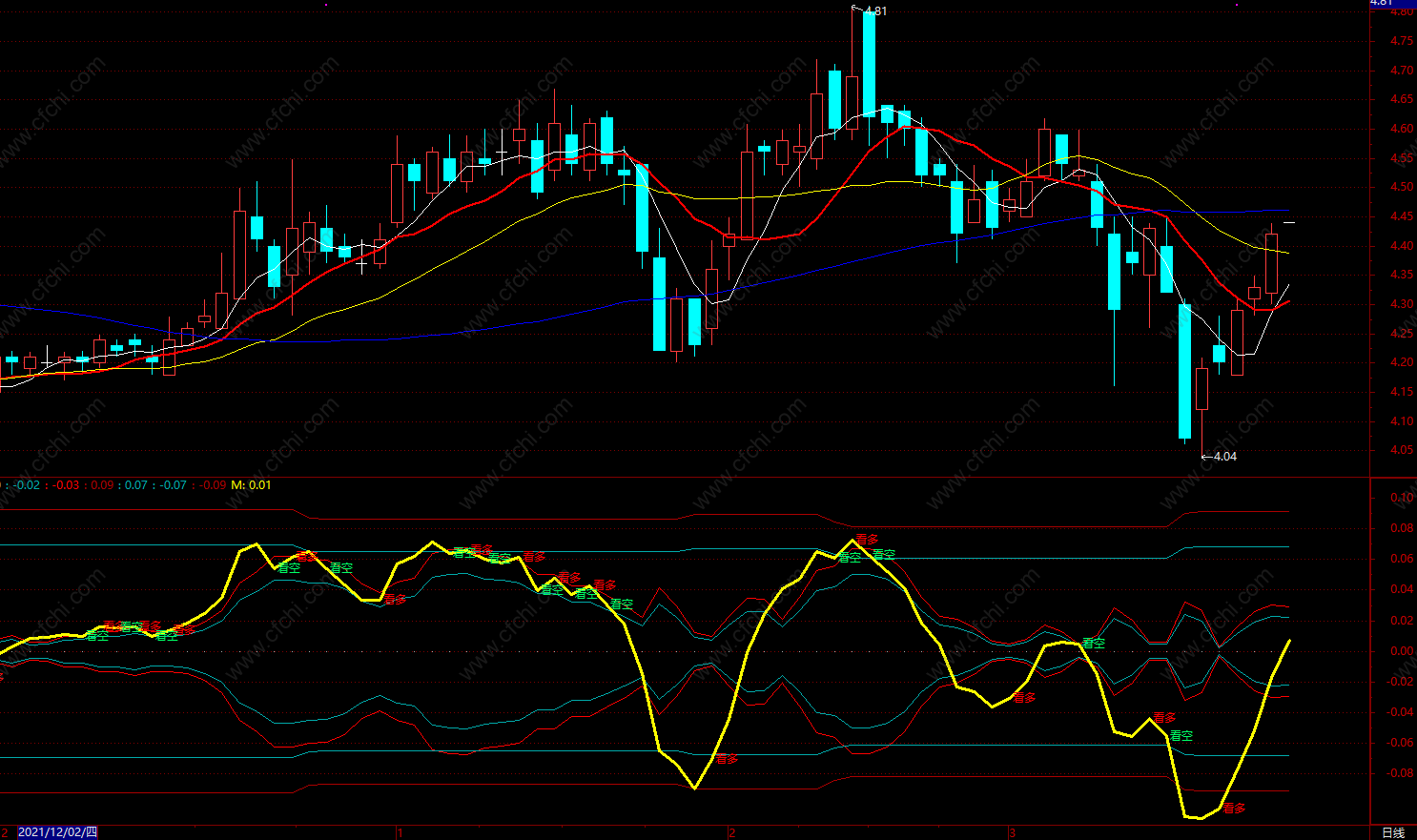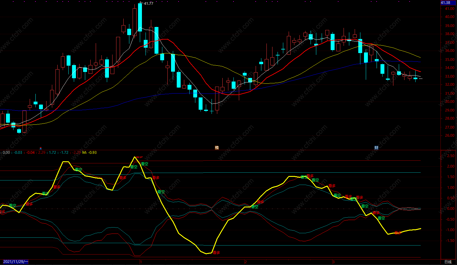 黄色线向上为看多信号,反之,为看空信号,低位看多高位看空信号更明确。