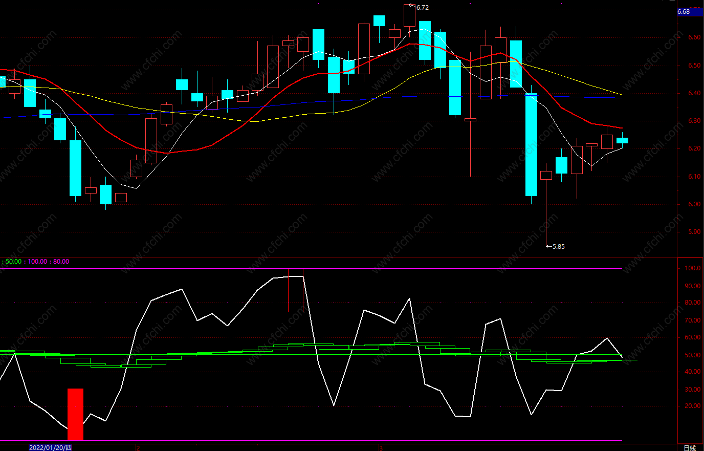 短期线(白线)大幅偏离长期线(绿线)时,是背离信号。在下方考虑买入,上方考虑卖出。