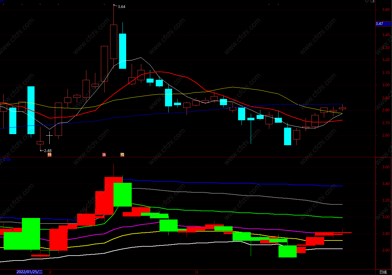 指标图形中白色线为主力底仓线,黄色线为建仓线,粉丝线为平衡线,低于白色线表示该成本较低,获利机会较大。