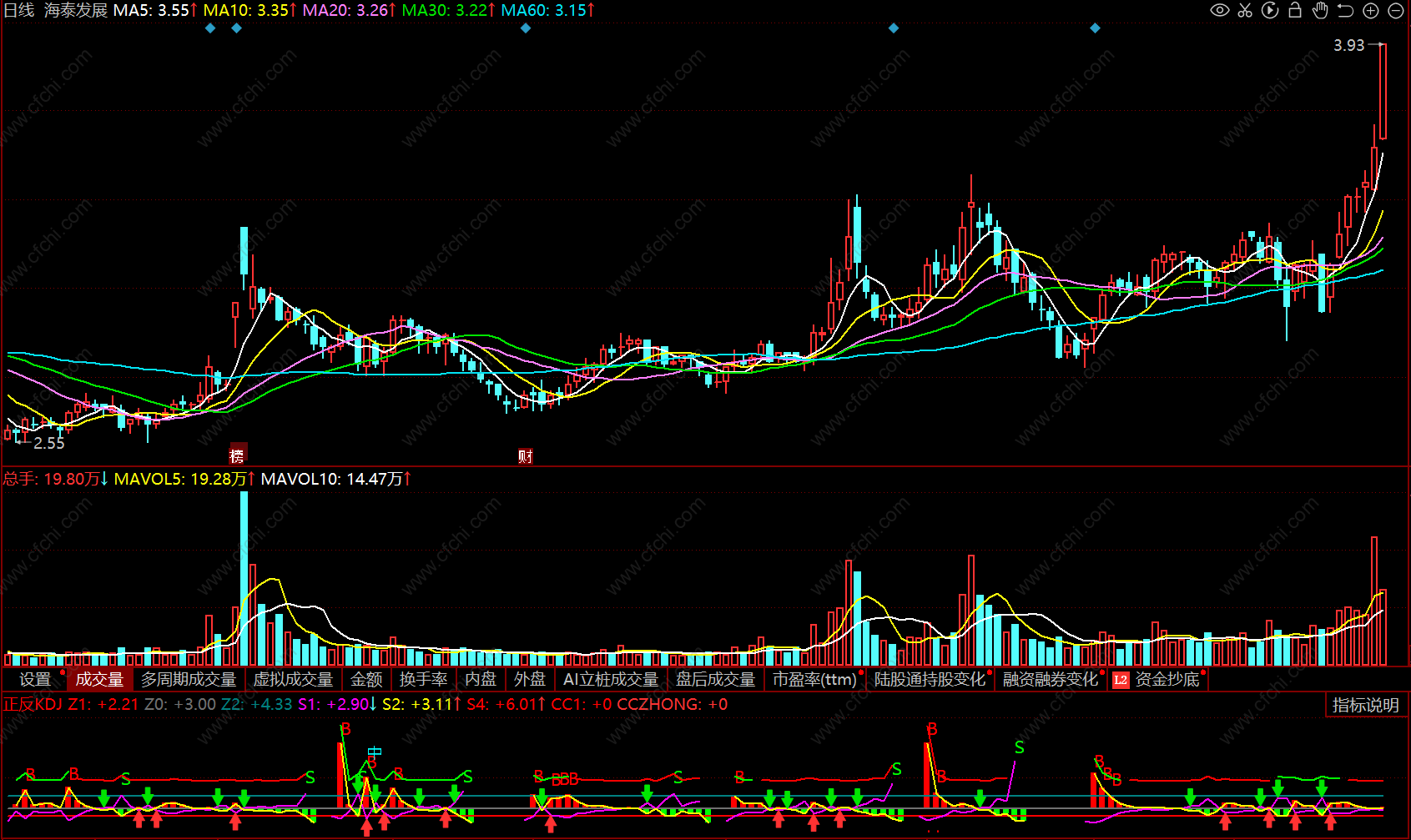 DRAWTEXT(CROSS(REF(S1,1),Z2)AND S2-S1>0.53,S3+2,"中"),COLORCYAN;