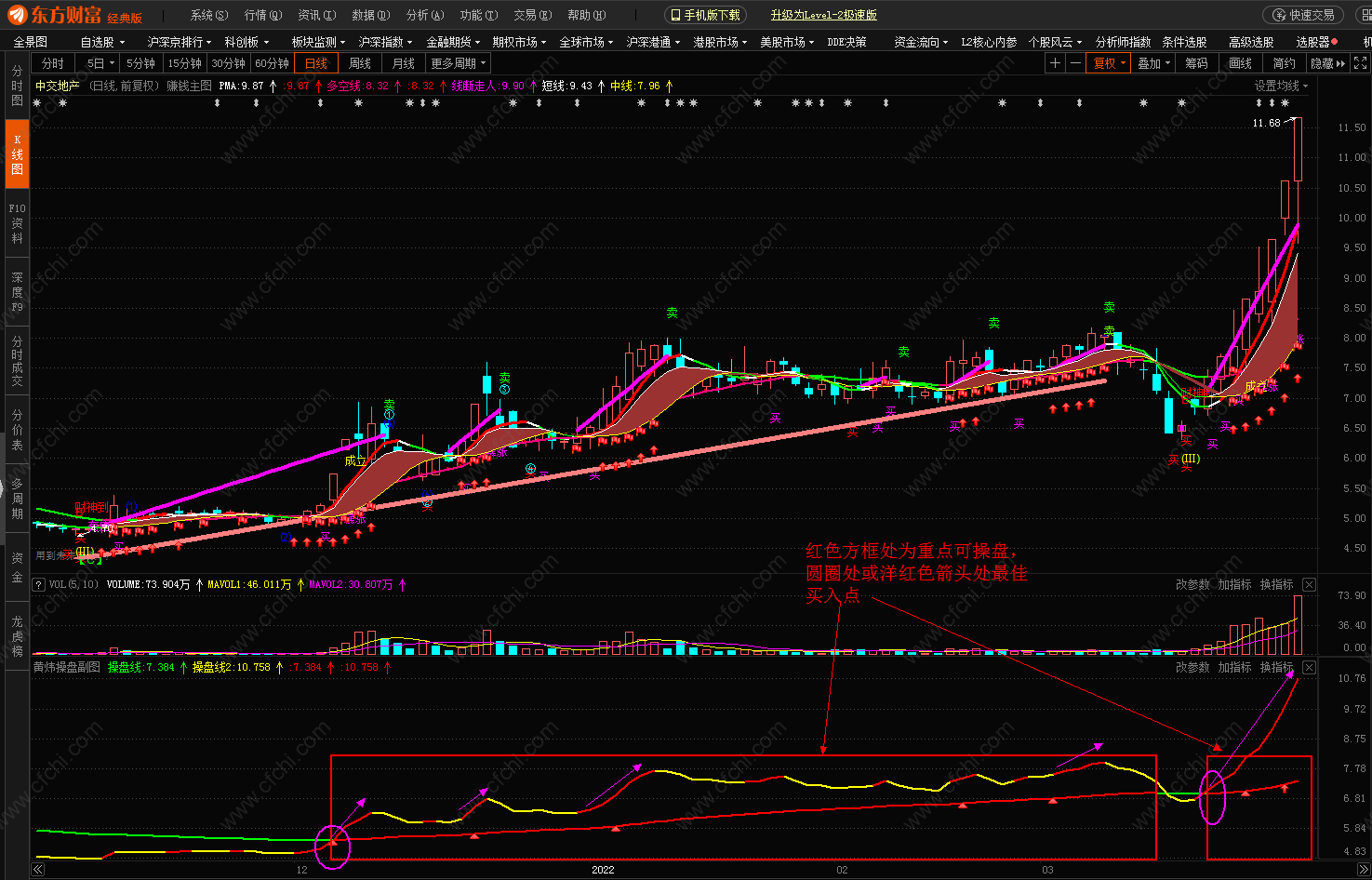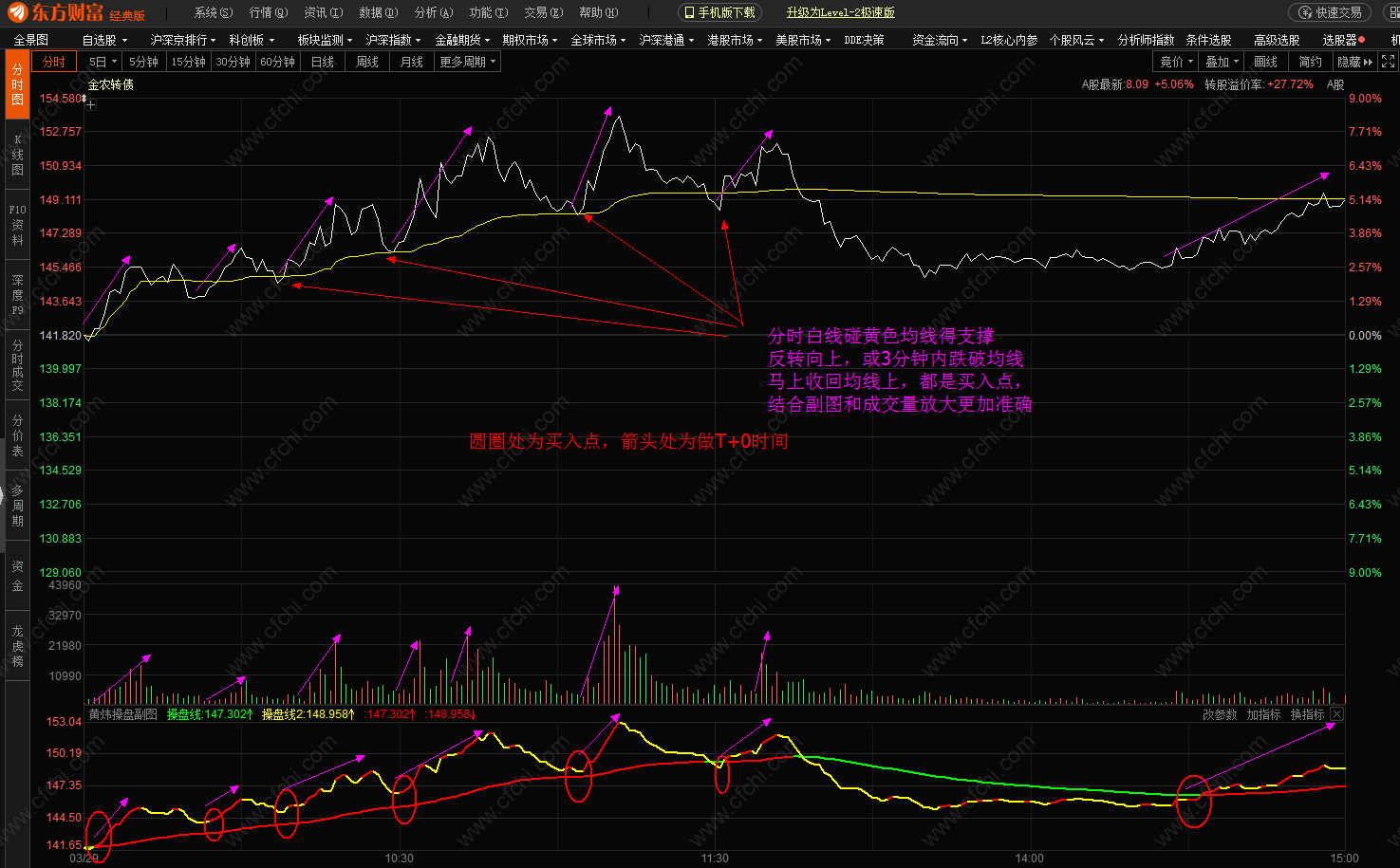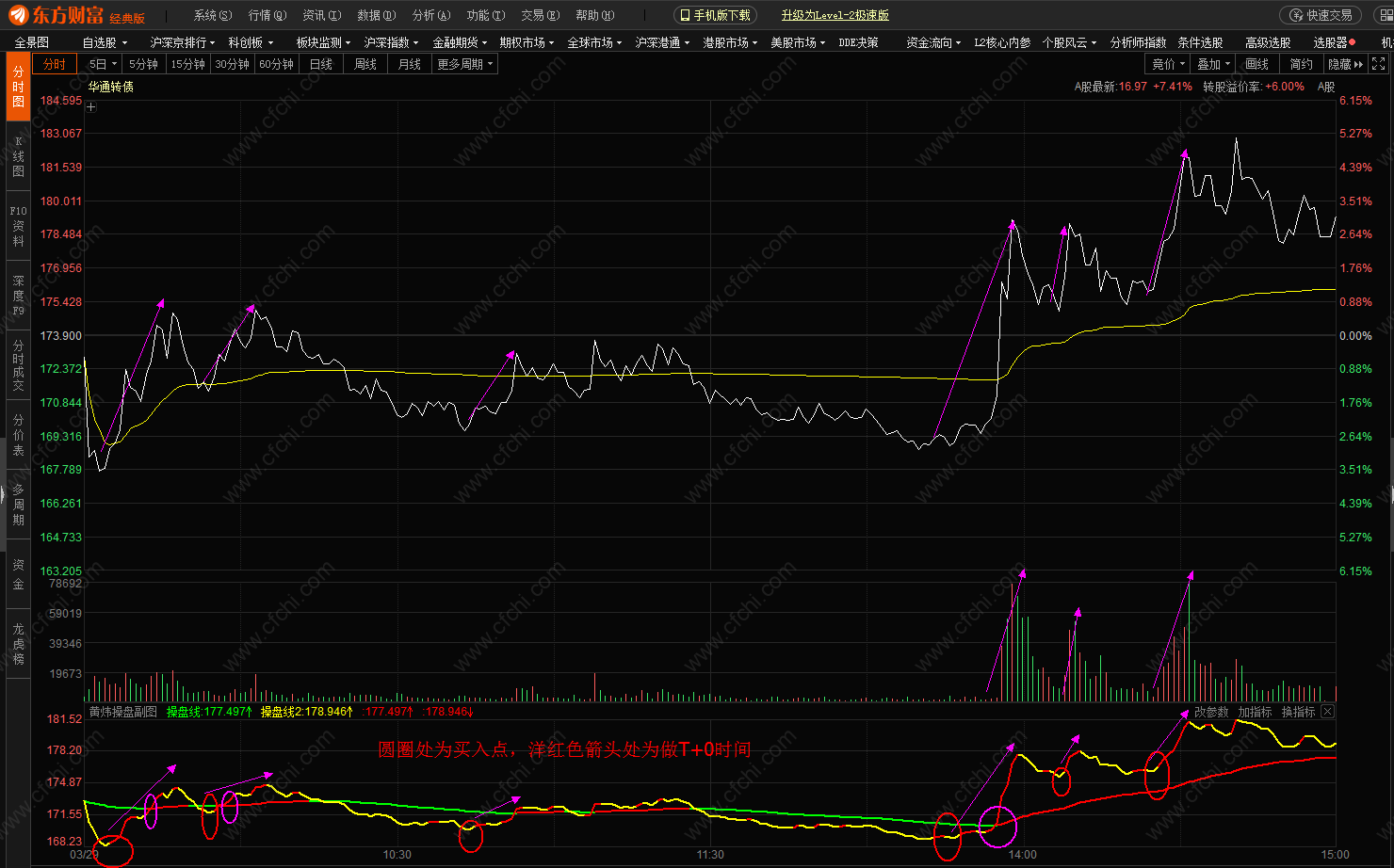(黄炜操盘副图,用于东方财富,T+0神器,也可用于日K线等副图,可用于股票,可转债,期货等做T+0.)