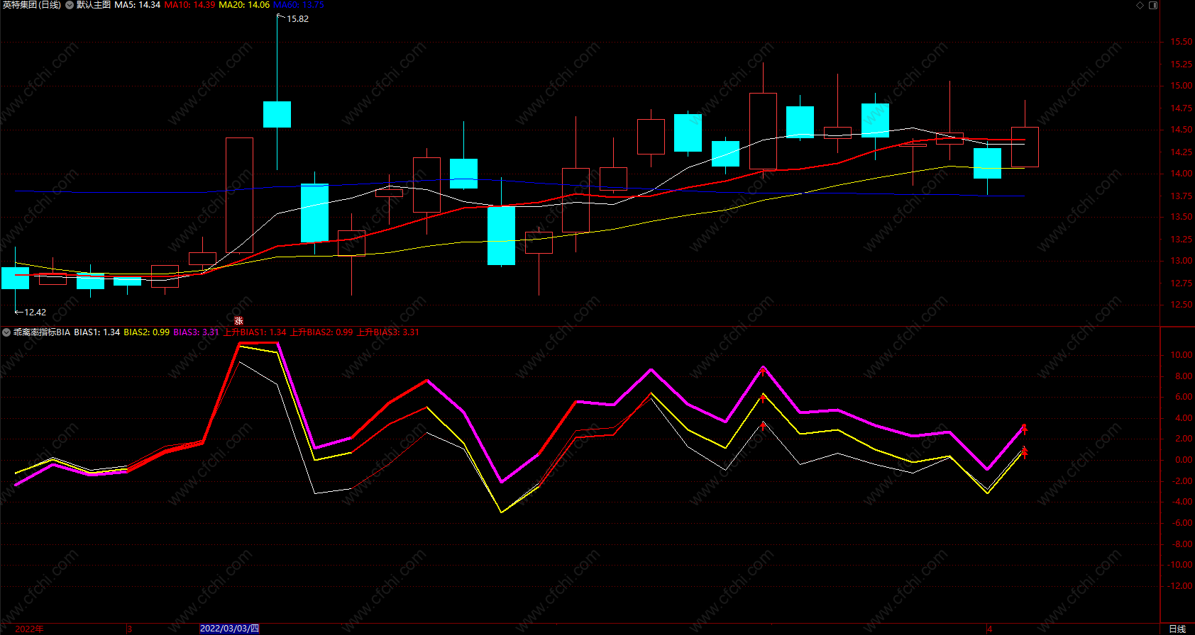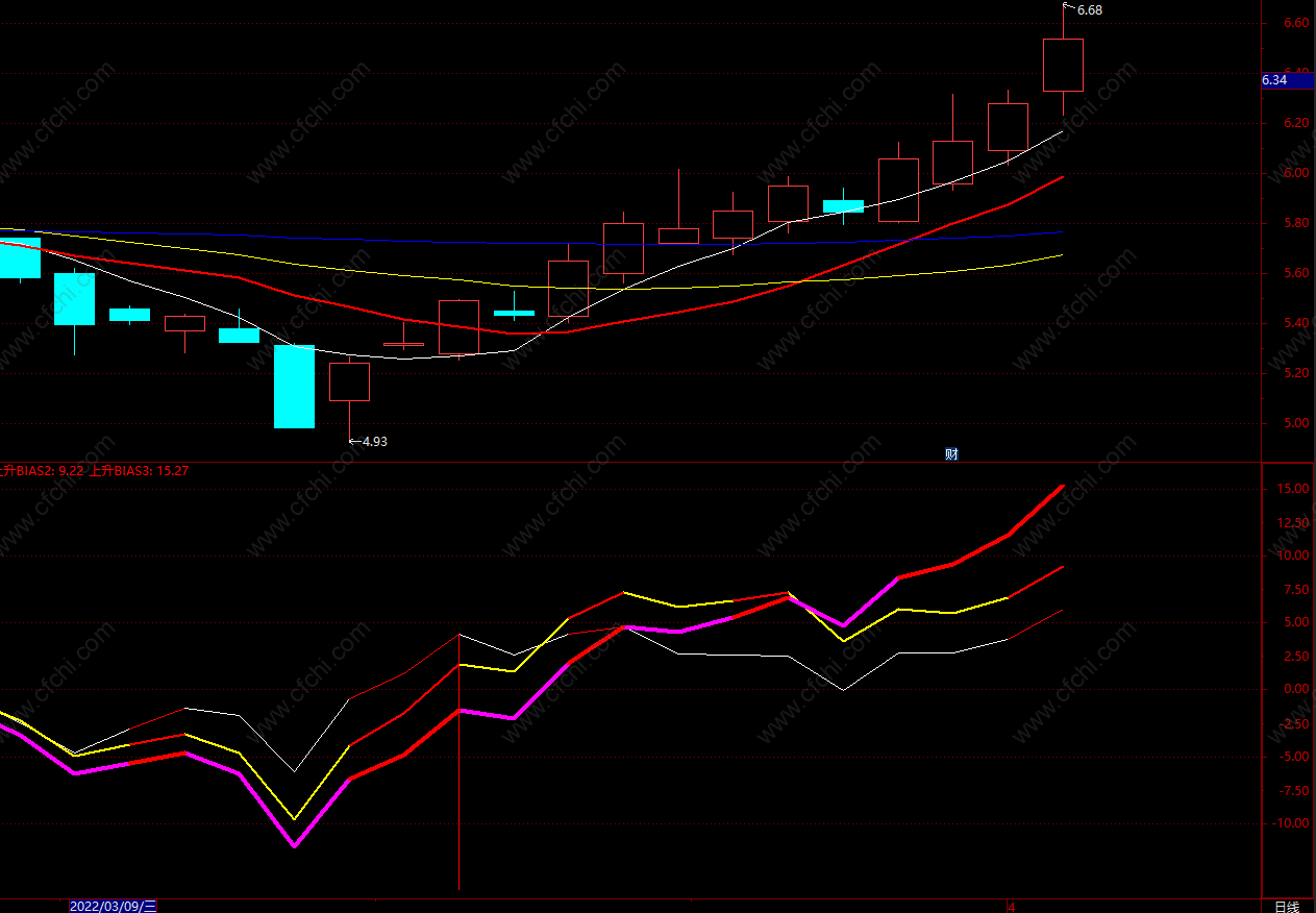 上升BIAS3:IF(BIAS3>REF(BIAS3,1),BIAS3,DRAWNULL),COLORRED,LINETHICK4;