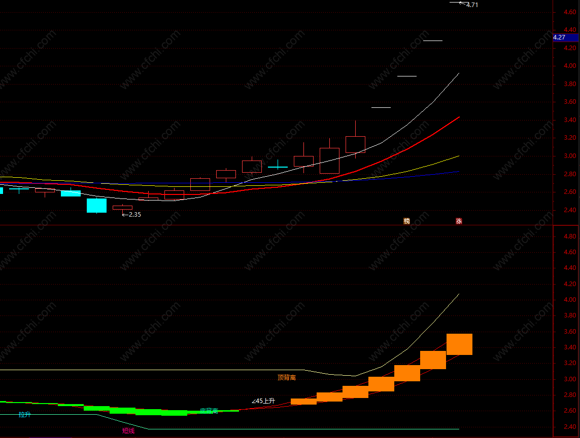 2、K线呈现45度角上升预示该趋势将加速。
