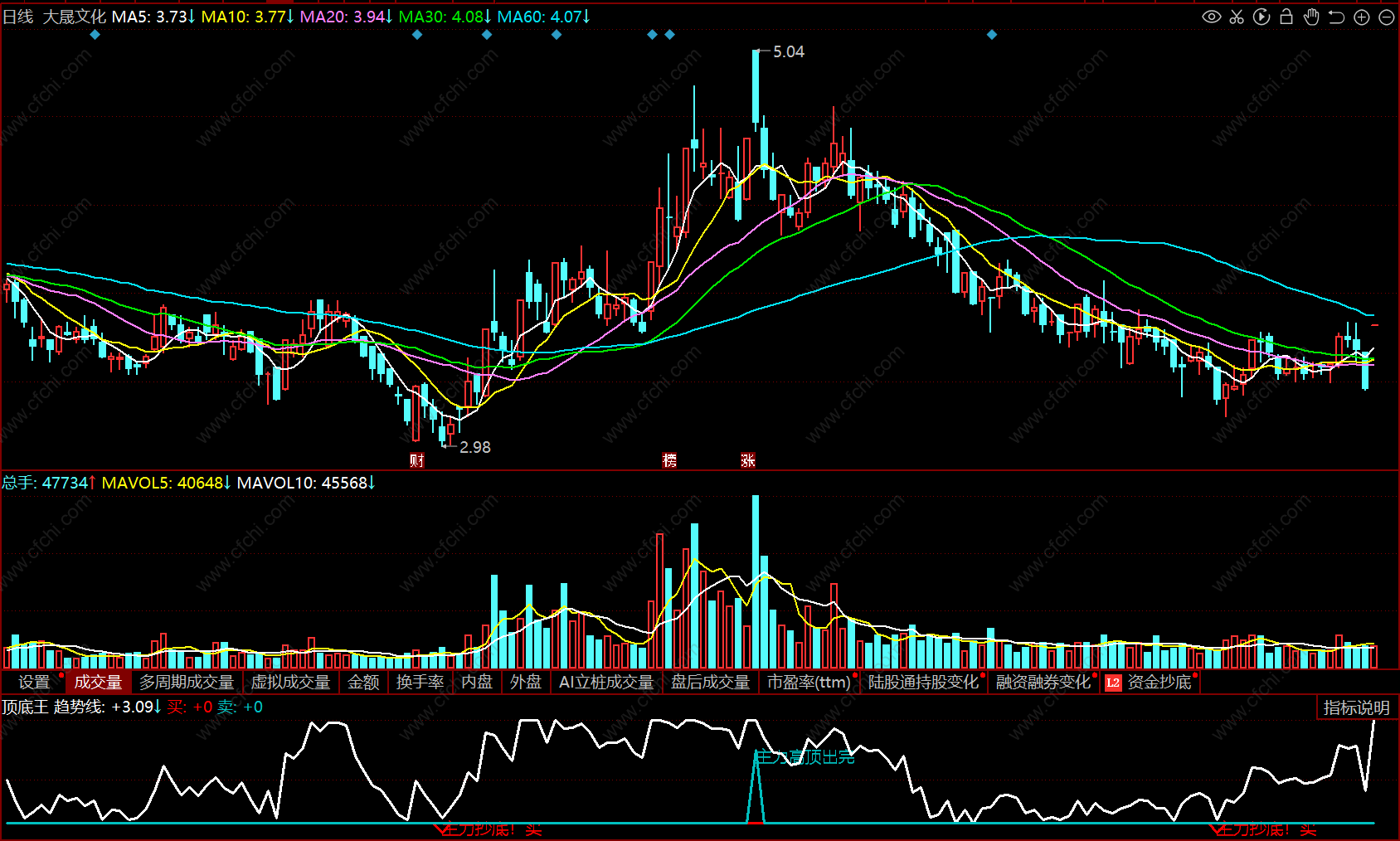趋势见图示,达到历史低点为底,达到历史高点为顶;顶底另见图标符示。