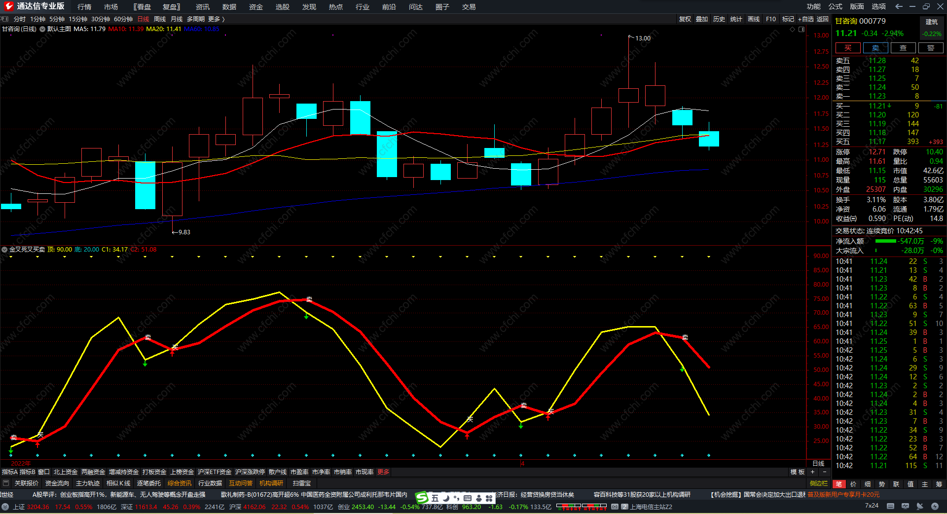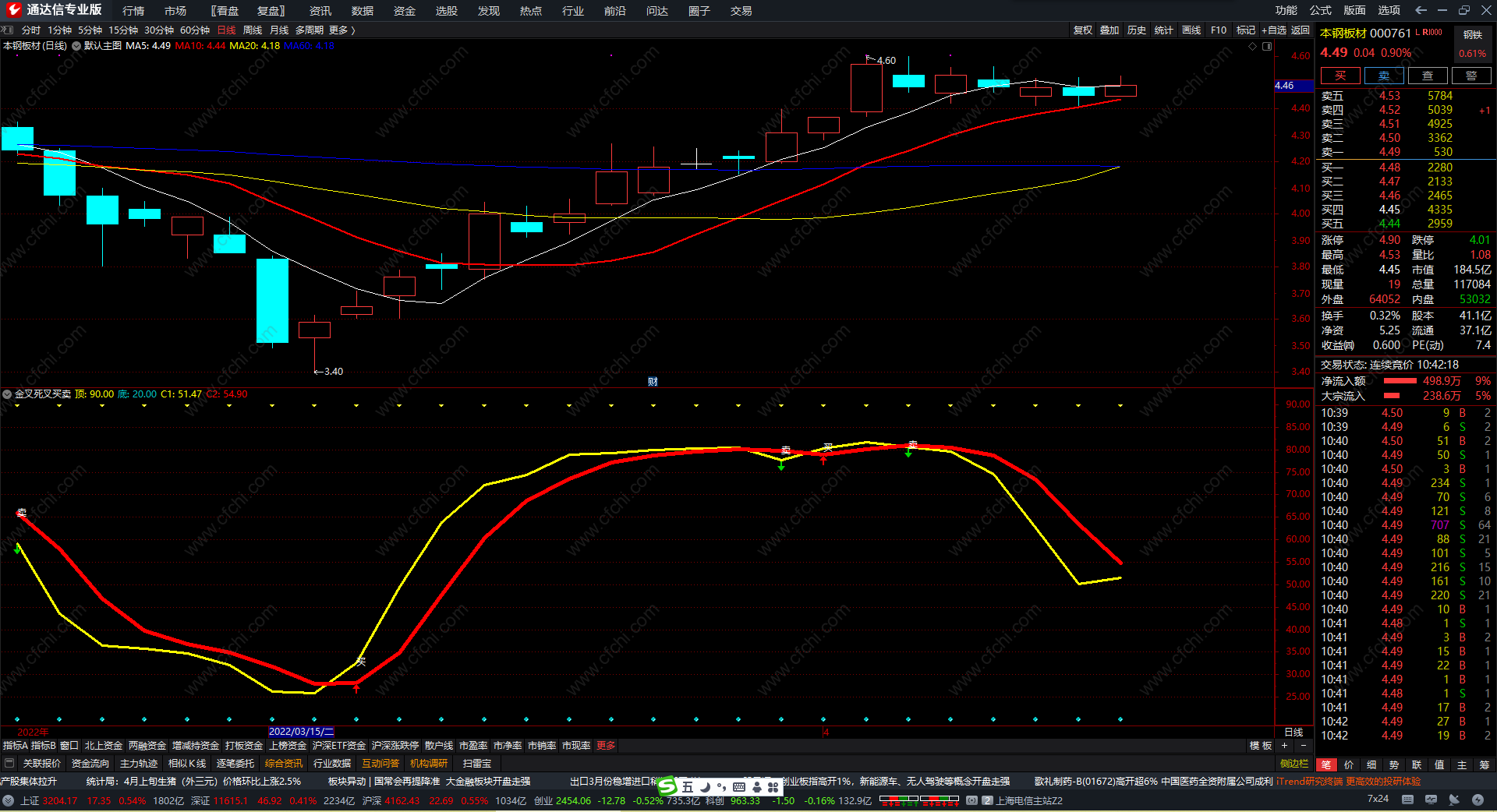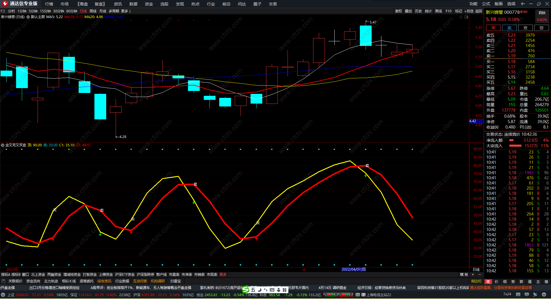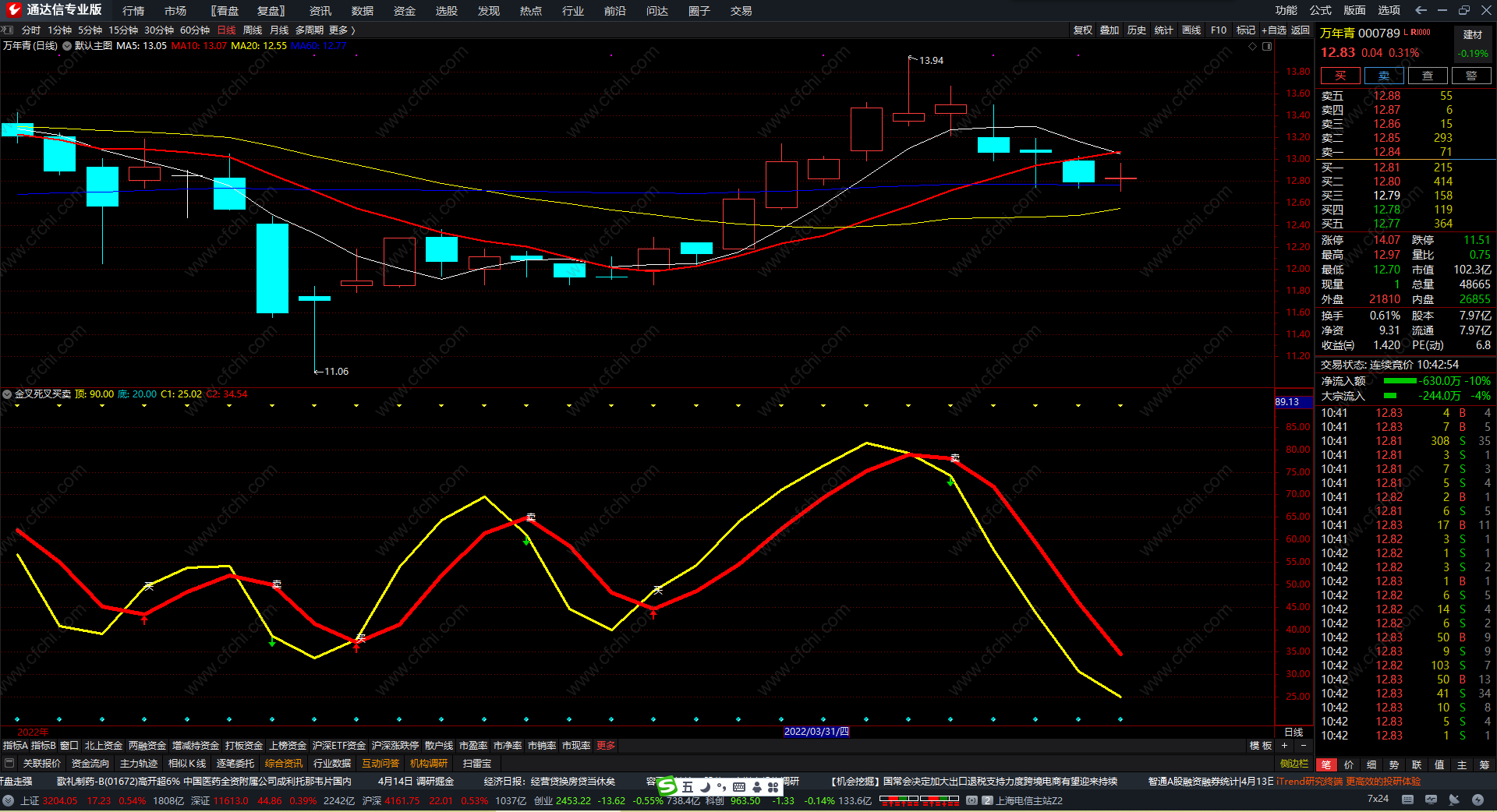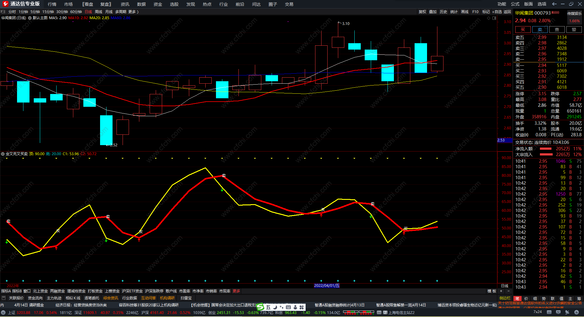 黄色圆点是顶,蓝色圆点是底,用来看股价位置高低。当黄色实线上穿红色金叉出现“买”是介入信号,当死叉出现“卖”是减仓卖出信号。
