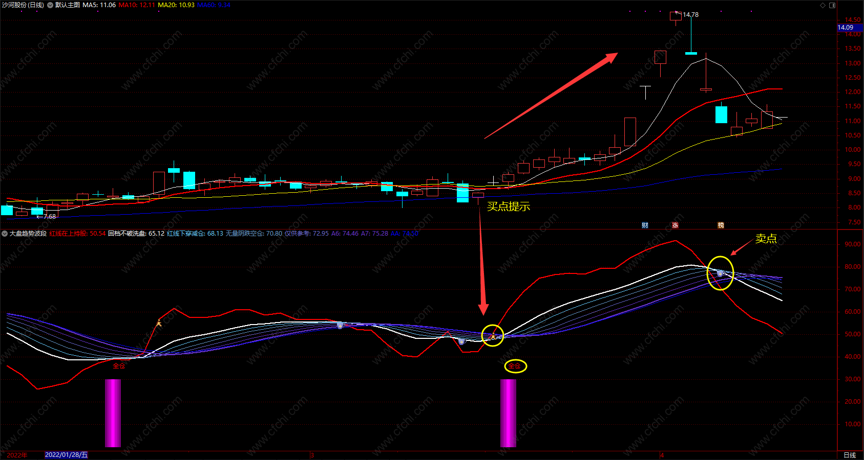 (大盘趋势波段指标公式 通达信买卖提示 副图 源码)