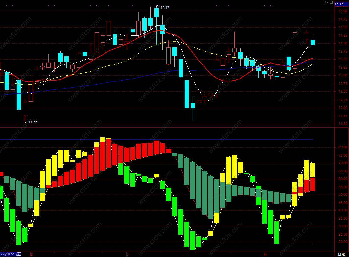 指标有两条长短趋势先组合而成,当同时出现红柱和黄柱时候代表短中期共振,为买入参考。出现绿柱减仓参考,出现蓝柱空仓参考。
