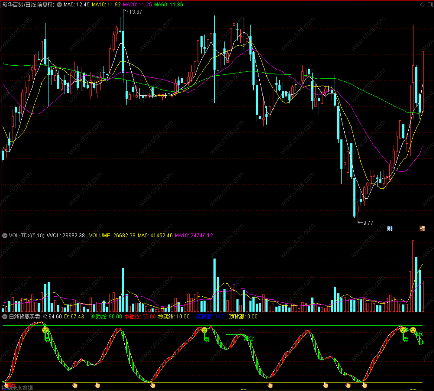 底背离:REF(CLOSE,A1+1)>CLOSE AND K>REF(K,A1+1) AND CROSS(K,D);
