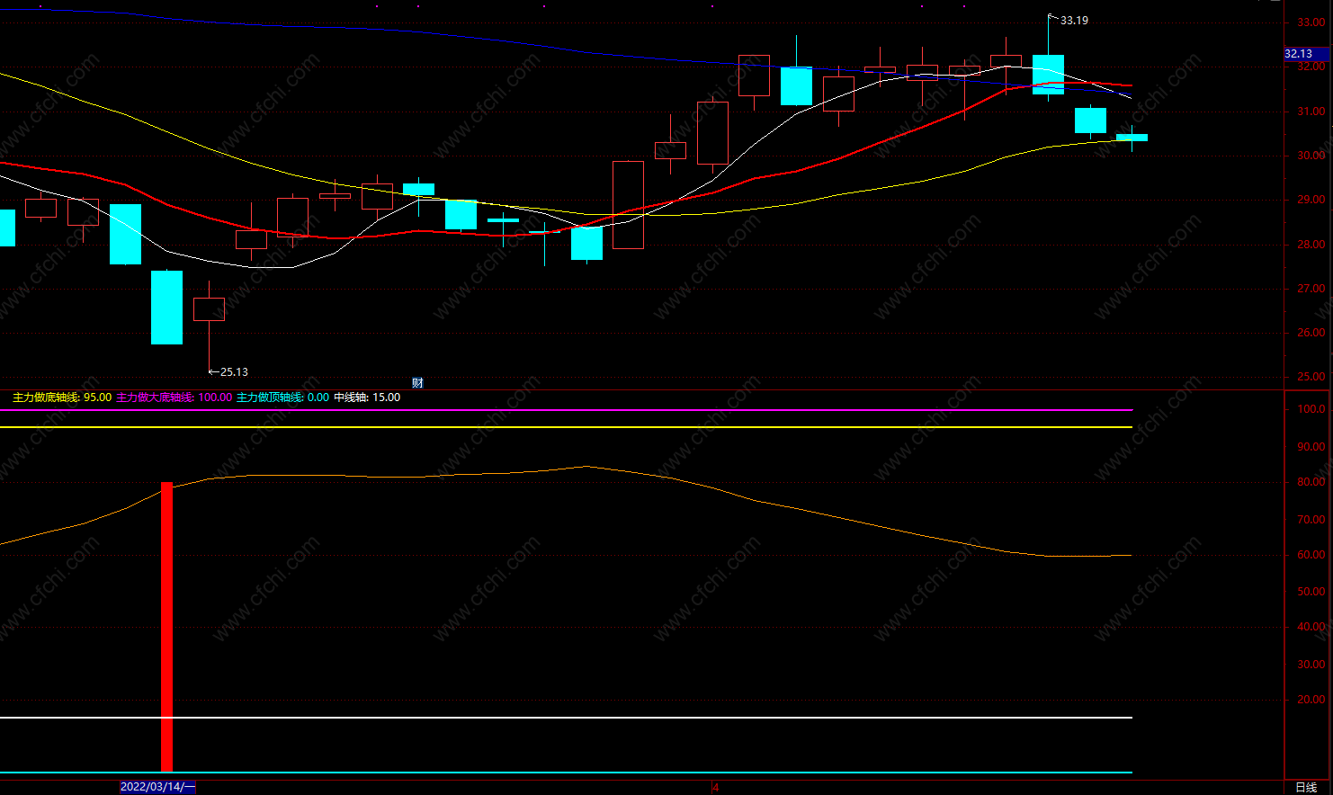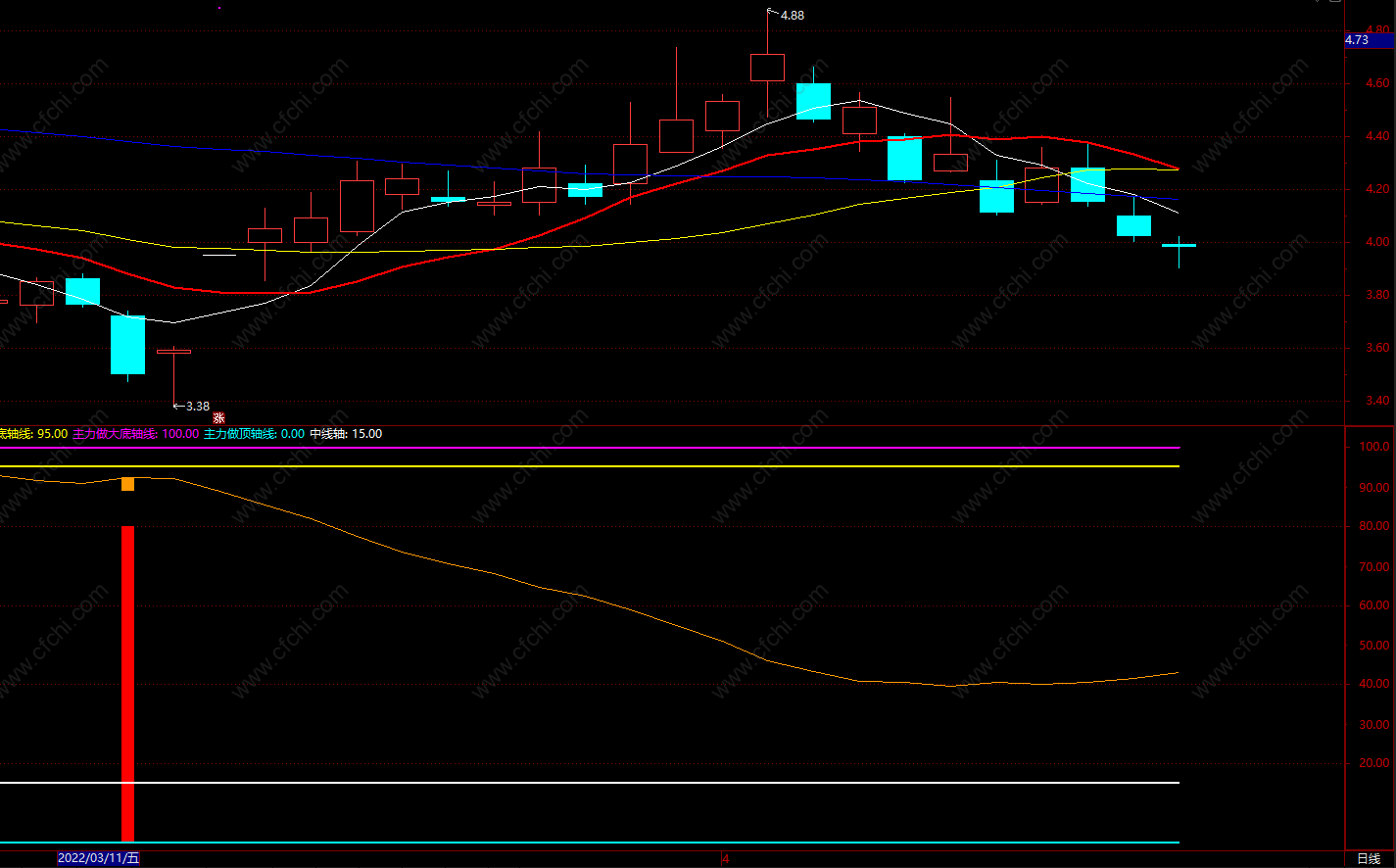 一、土黄线为主力筹码动向,向上为吸筹,向下为逐步派发筹码,土黄线上的土黄色竖线为主力开始筹集的筹码。