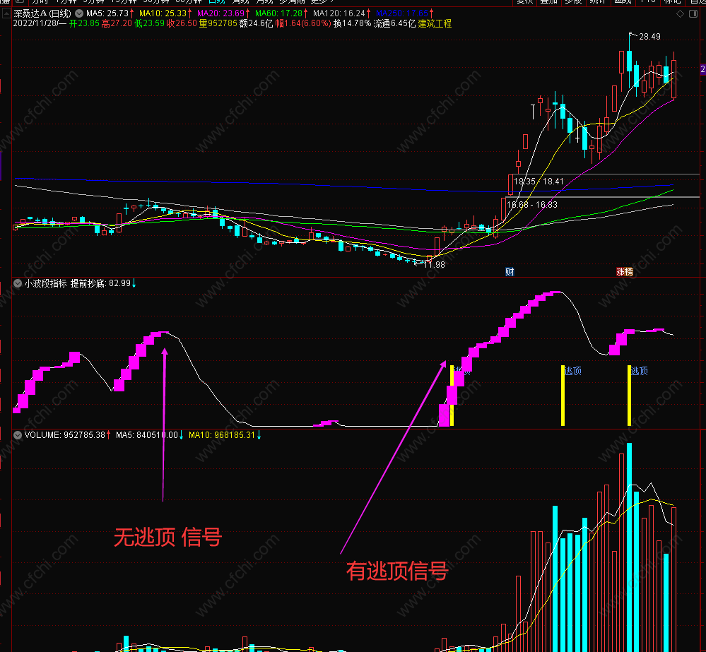 1、这个波段股票指标信号简单,就是粉色,无色、逃顶信号三个情况