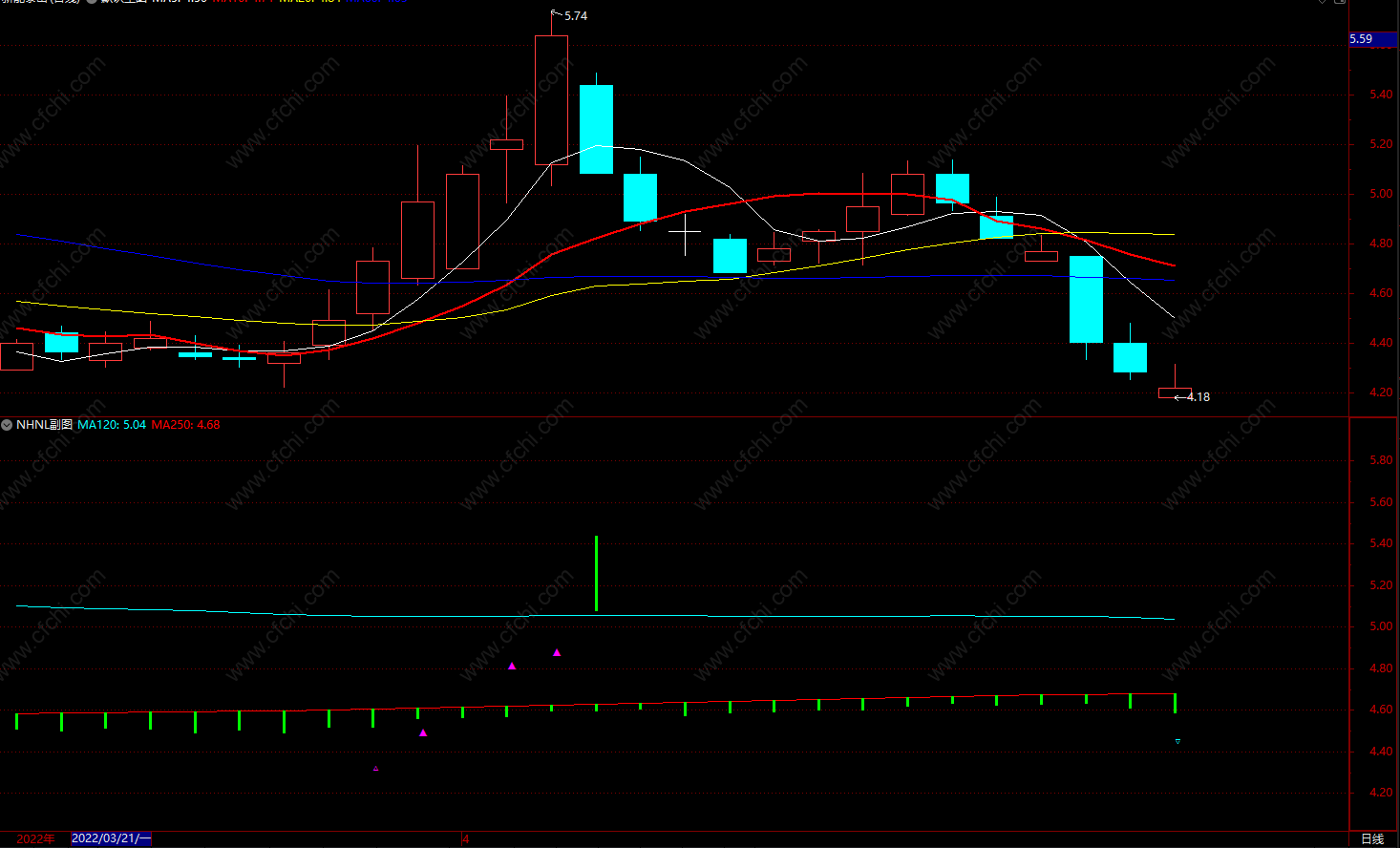 (MA250+((MA120-MA250)-(REF(MA120,1)-REF(MA250,1)))*10),0.1,0),COLORFF00FF;