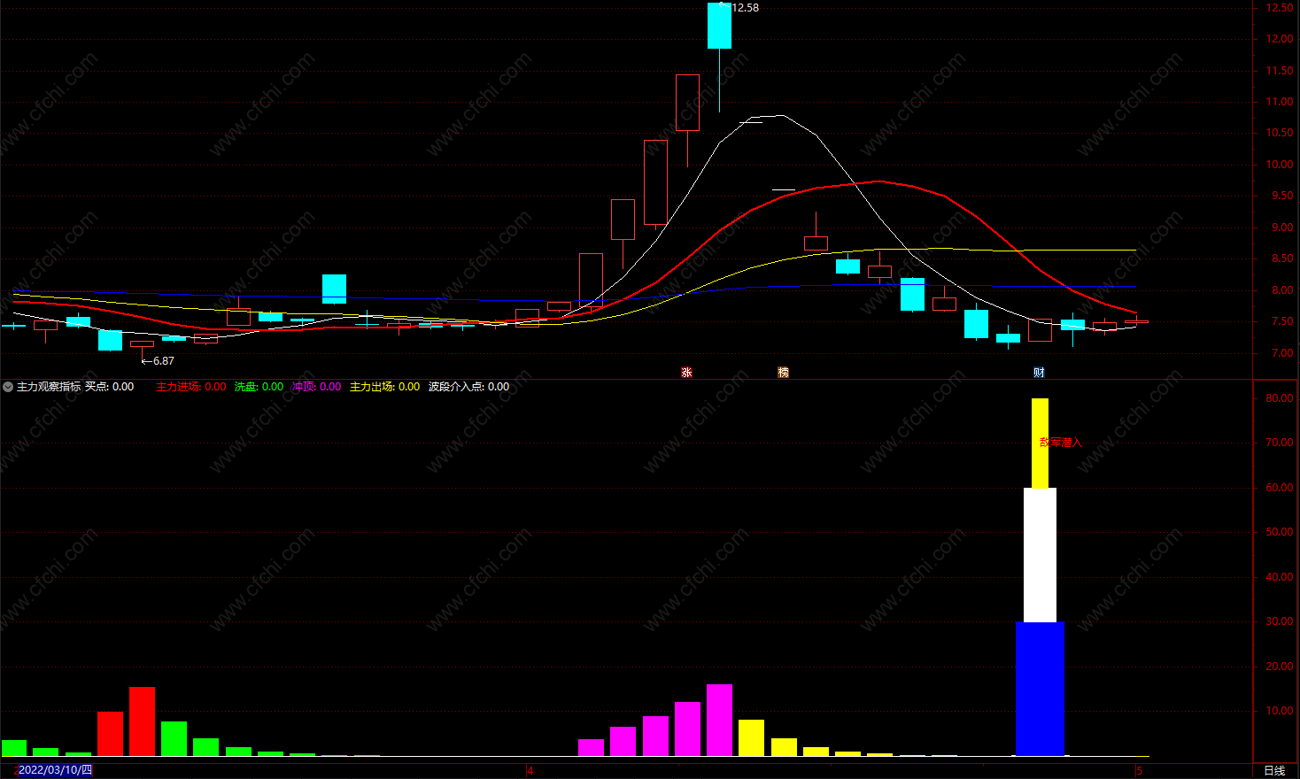 没有百分之百的指标公式,指标只是一种参考,其中的冲顶,和敌军潜入提示,有一定的参考价值,本指标要配合KDJ,一起使用,效果更好。最后要注意的是,敌军潜入提示,一定是要到调整到位的时候,出现提示才可出手。
