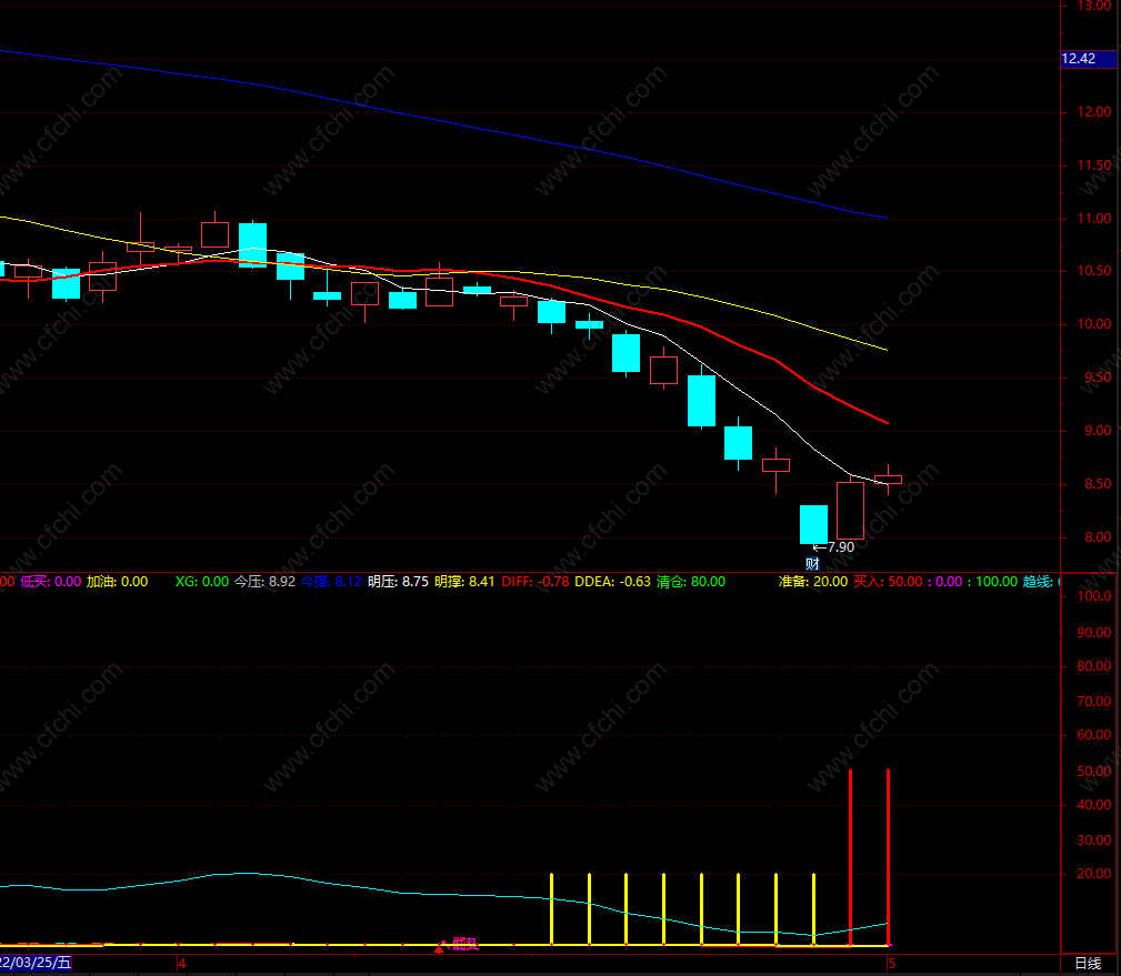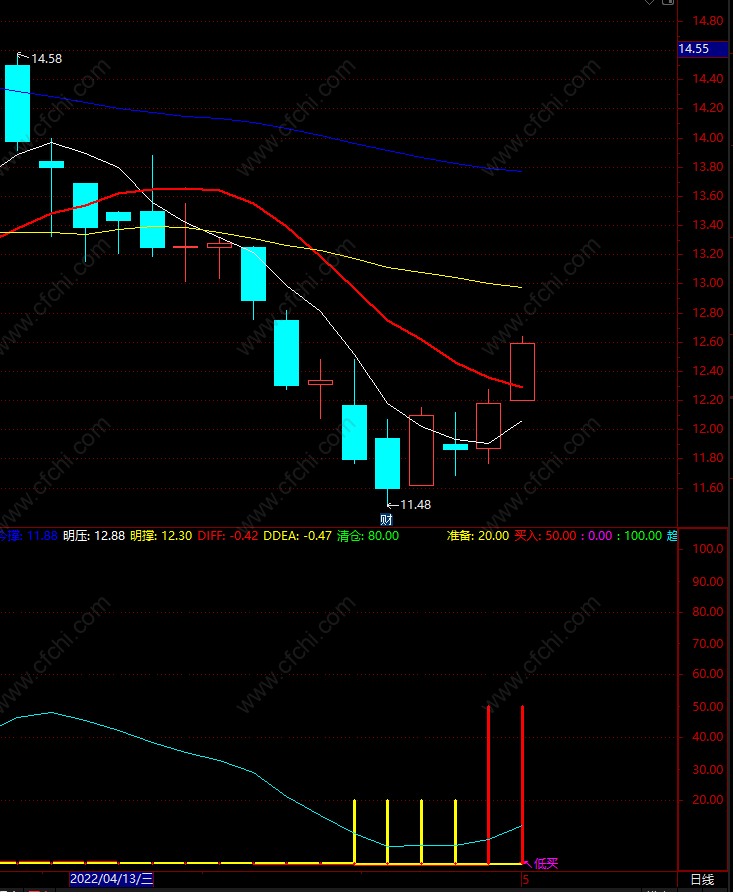 低买:CROSS(DIF,DEA) AND DIF<0,COLORFF00FF,NODRAW;