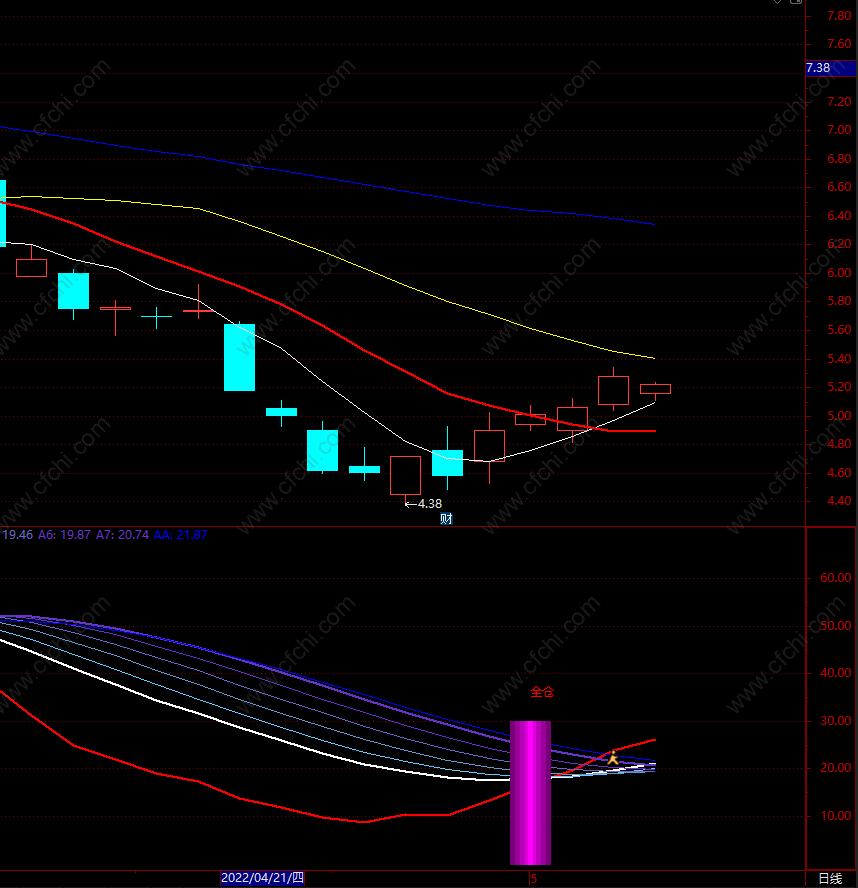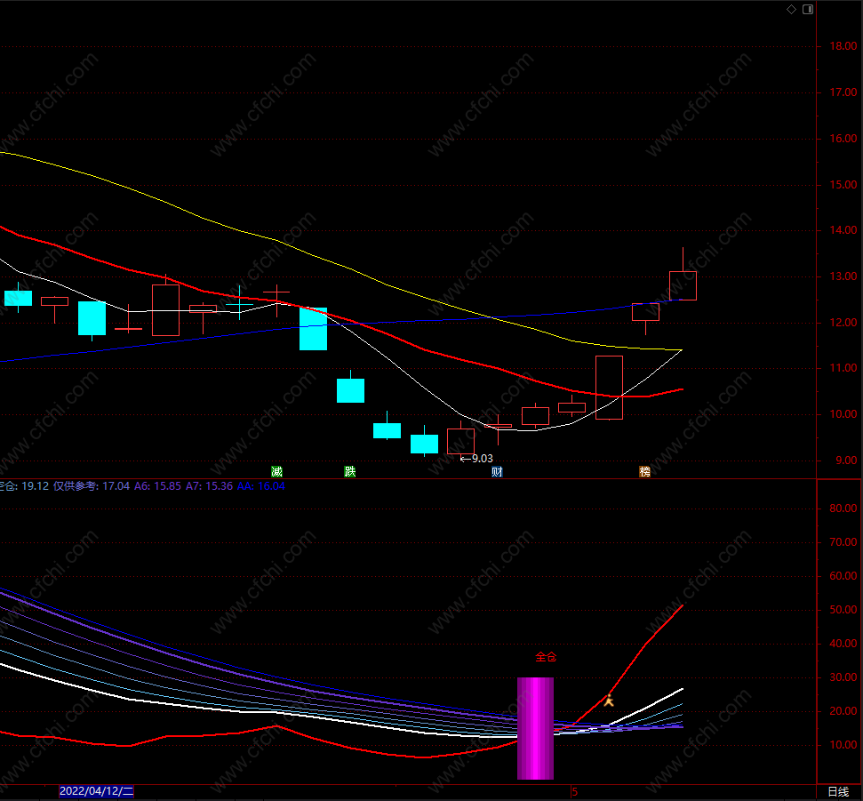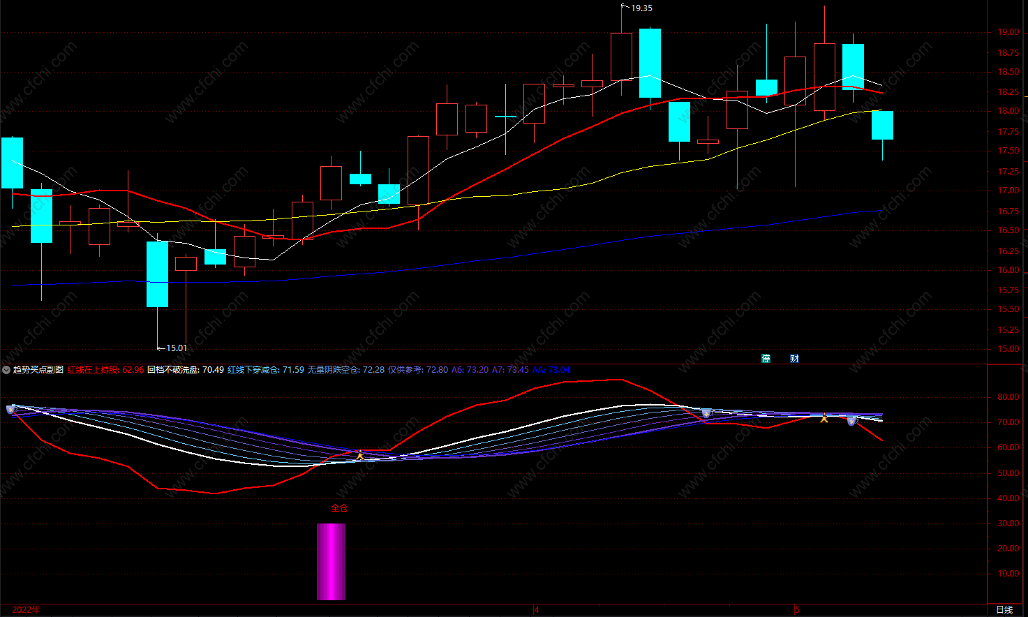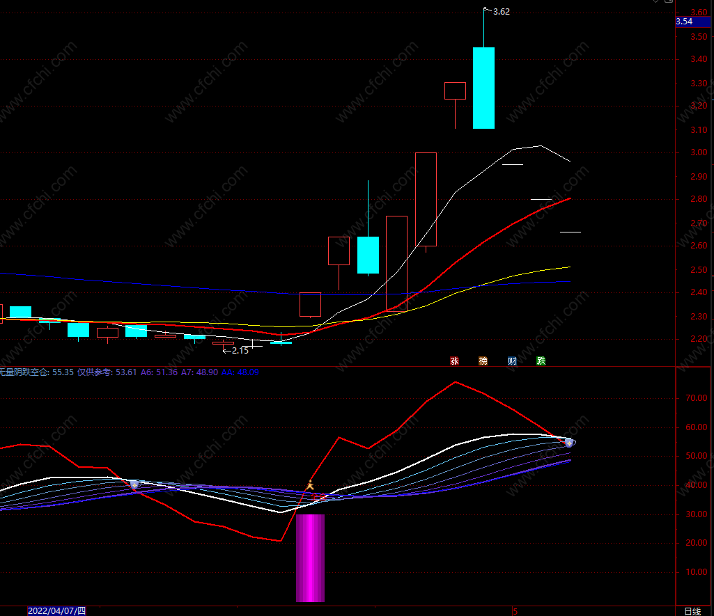 有点像均线瀑布,当红色线上传白色线是买入信号。在低位的信号要稳妥些。如果此时同事出现紫色柱子,发出全仓的问题提示为共振。