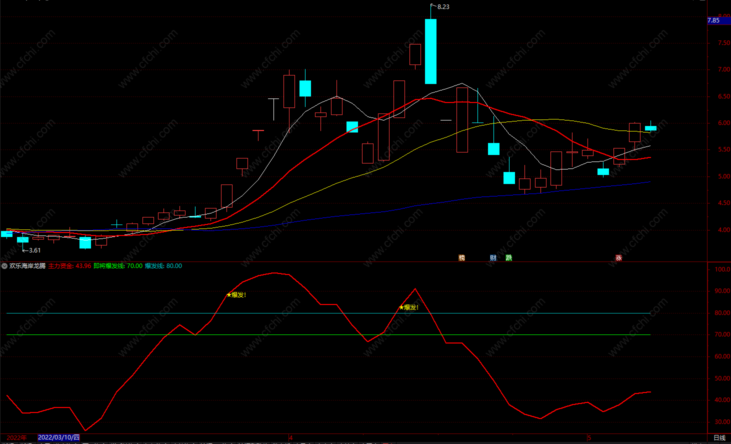 DRAWTEXT(CROSS(主力资金,爆发线),主力资金,'★爆发!') ,coloryellow;