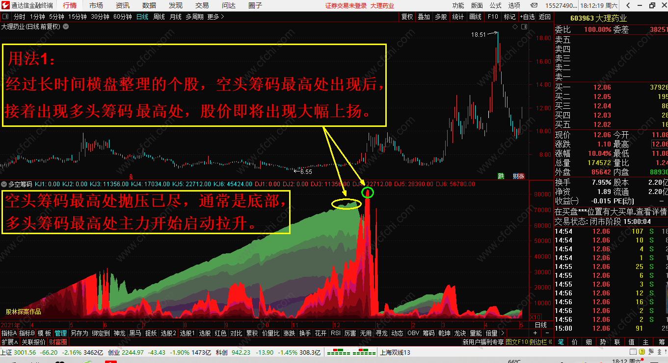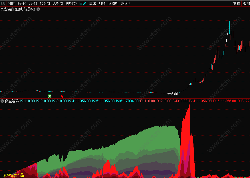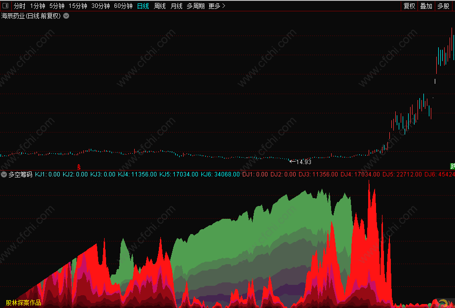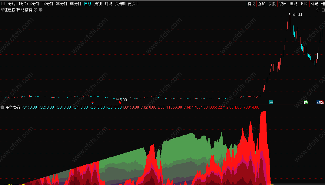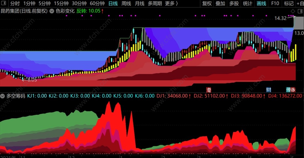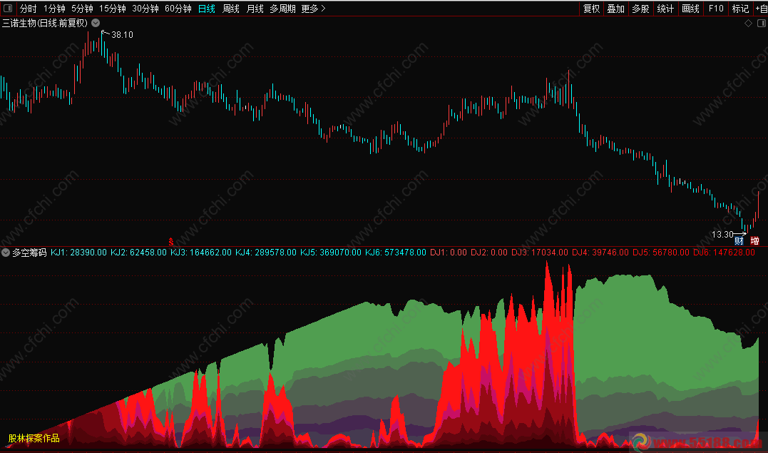 蓝色系色块代表空头筹码,红色系色块代表多头筹码,由于时间关系,指标的用法就不多做说明了。股友们自己对照个股走势研究,自然能看出指标的神奇妙用。