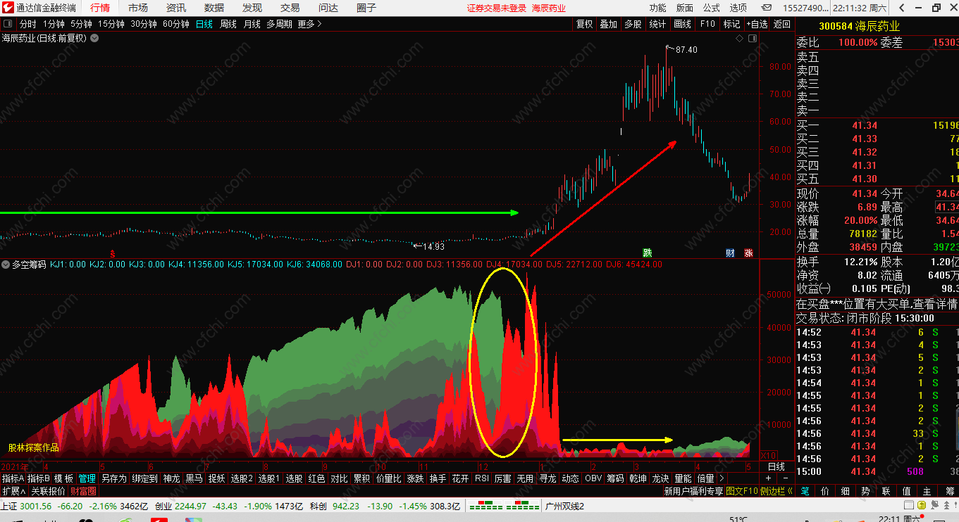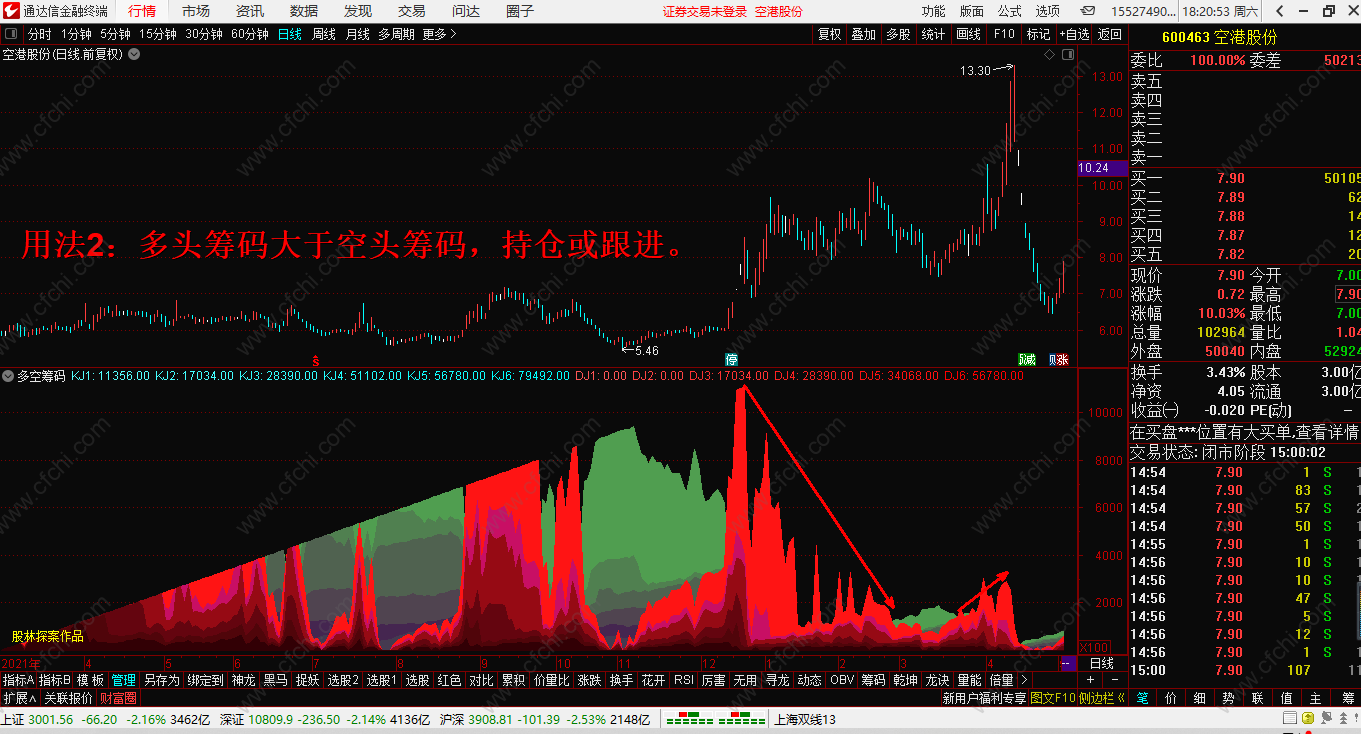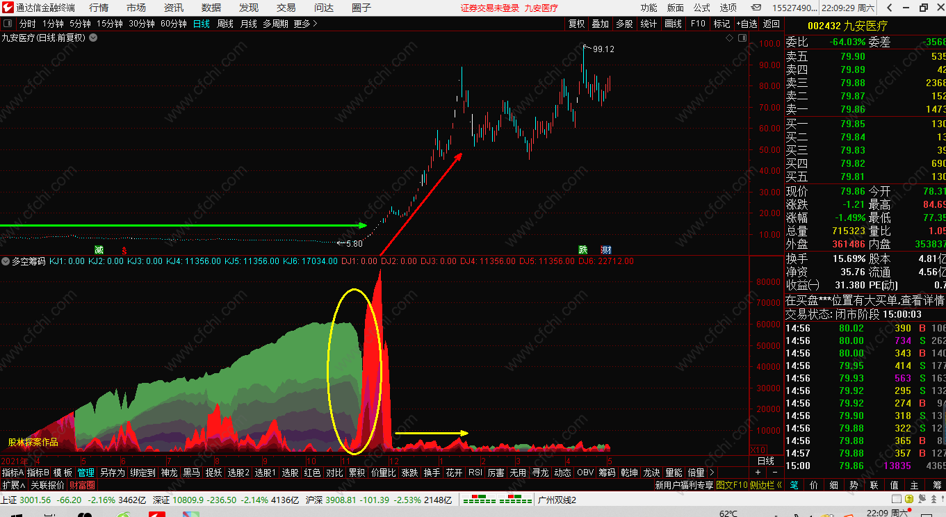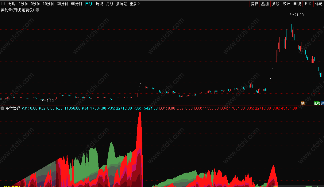 蓝色系色块代表空头筹码,红色系色块代表多头筹码,由于时间关系,指标的用法就不多做说明了。股友们自己对照个股走势研究,自然能看出指标的神奇妙用。