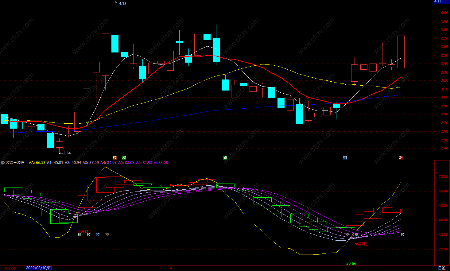 DRAWTEXT(CROSS(AA, A5) AND REF(AA,1)<34,REF(AA,1),'☆发财了'), colorred ;