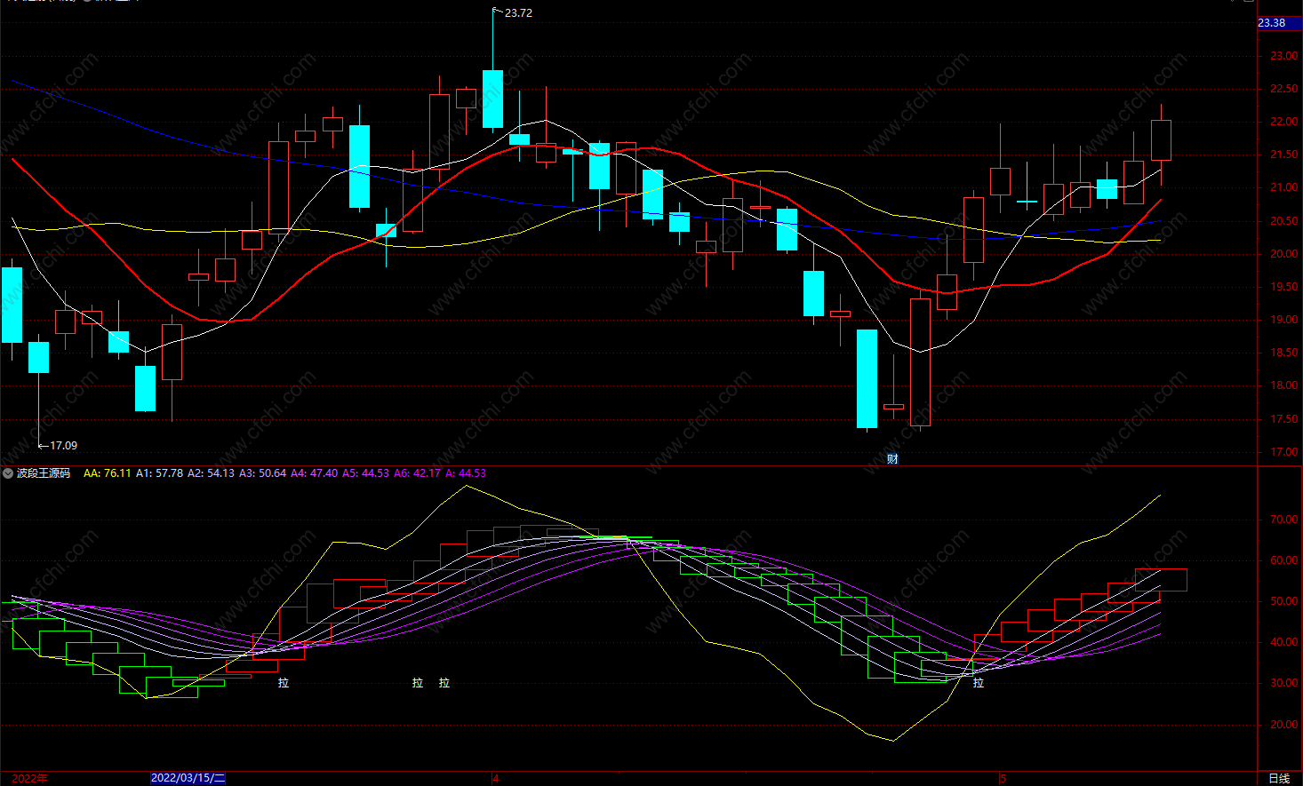 DRAWTEXT(CROSS(A1, AA) AND REF(AA,1)>80, REF(AA,3), '☆闪人'), COLORCFB53B ;