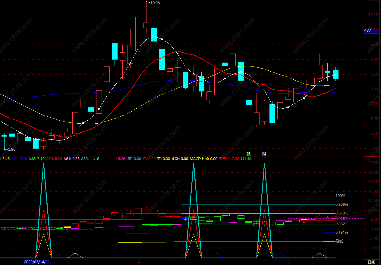 在1.191-1.382可作差价,高抛低吸,不必害怕,此区域一般不会套您,庄家获利不是很大,且在拉升途中,庄家自己也会高抛低吸来降低自己的持股成本,对自己熟悉的股票多做差价,也要敢于作差价。 1.382线是强阻力位,强阻力位有很长时间的盘整,而一旦有效突破,股价就很难再跌破1.382线,最好在1.191价+(1.382价-1.191 价)*0.618位抛掉)。