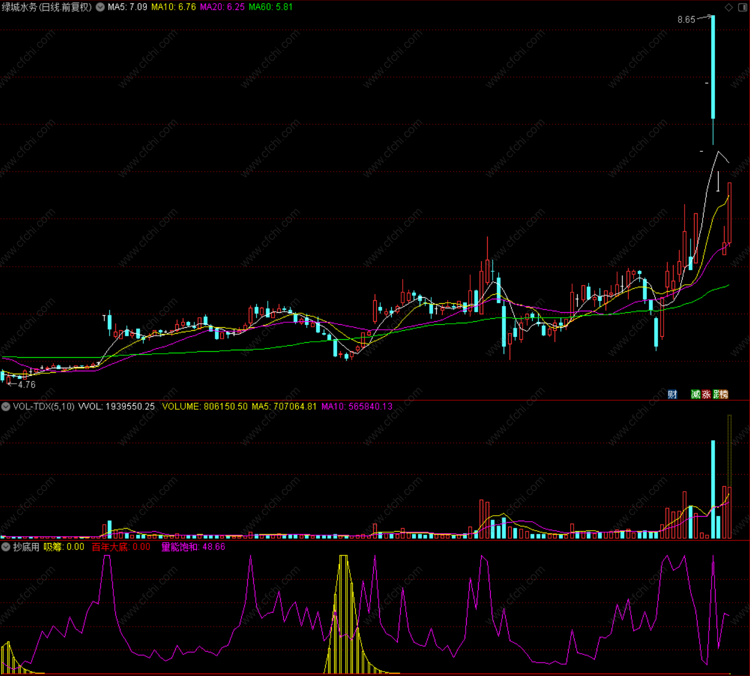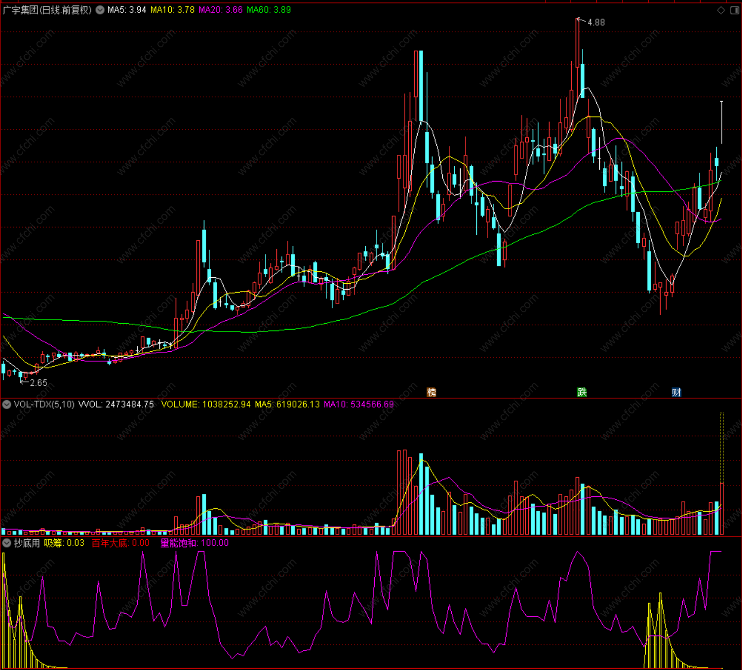 至于“量能饱和”其实就是成交量,在底部当然是大一点好啊,在顶部嘛太大就危险了!呵呵,各位自己研究一下吧,很好用的