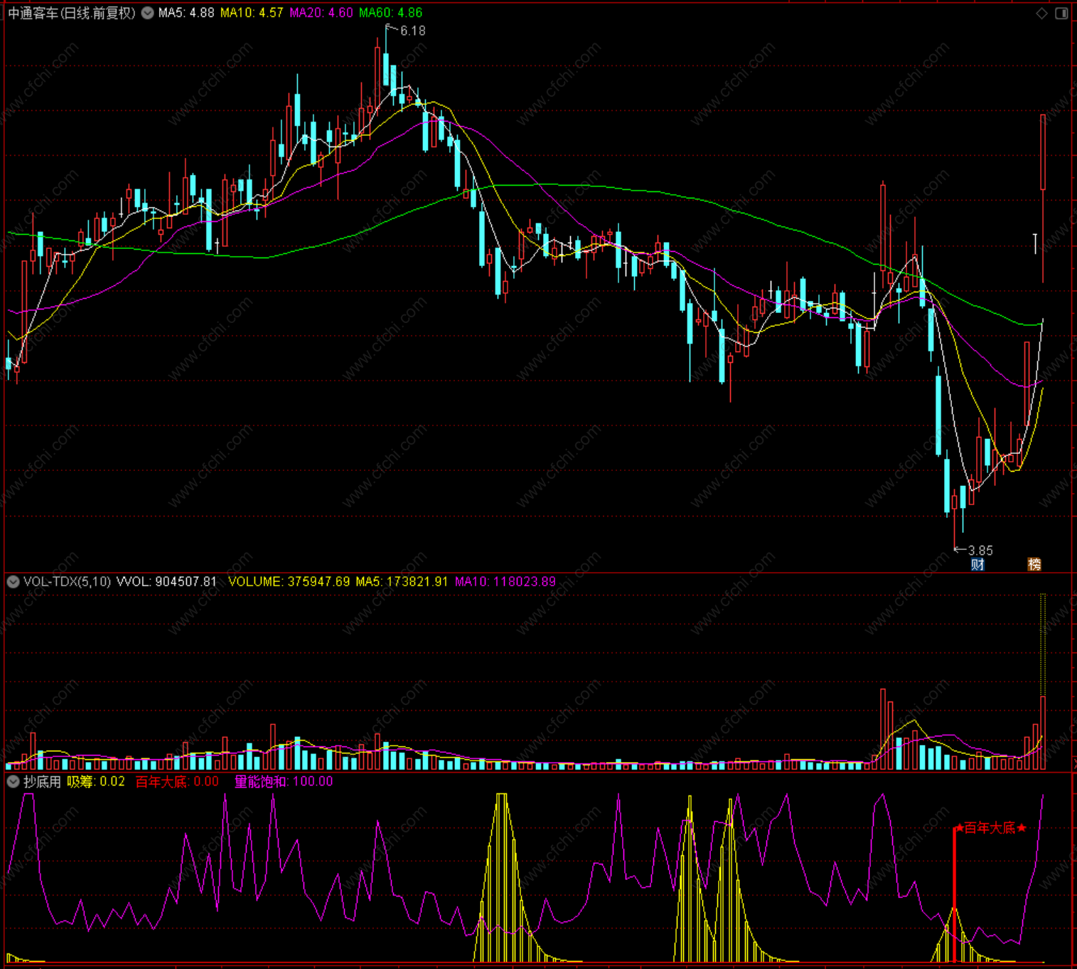 百年大底:C>REF(C,1) AND REF(GG,1)>0 AND VAR3,,COLORRED;