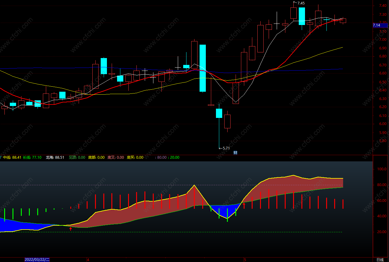 1、当日线的长线、中线、短线趋势向下,(则短期看空),而中线上穿长线,(则短期看多)。