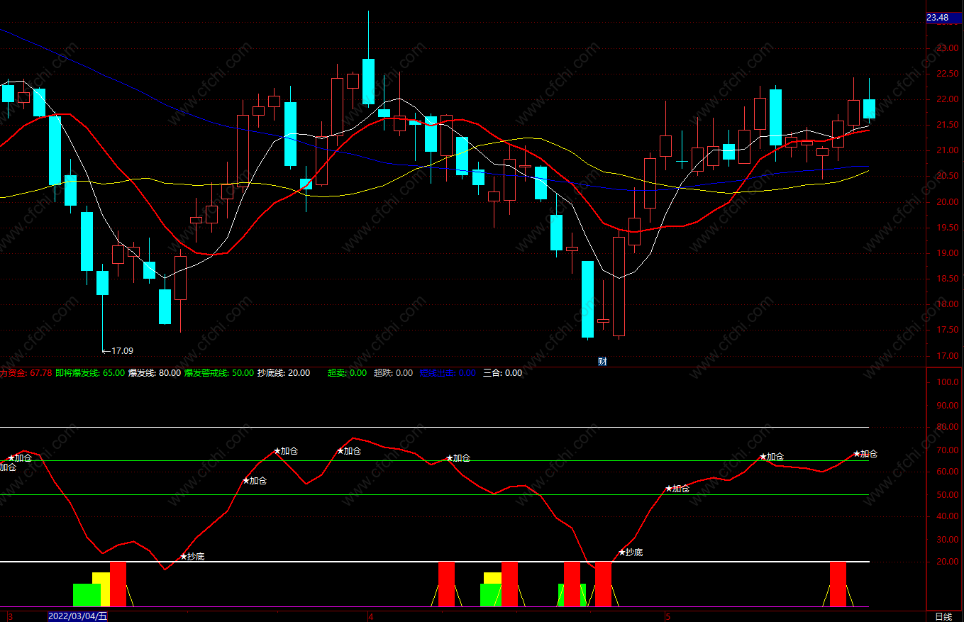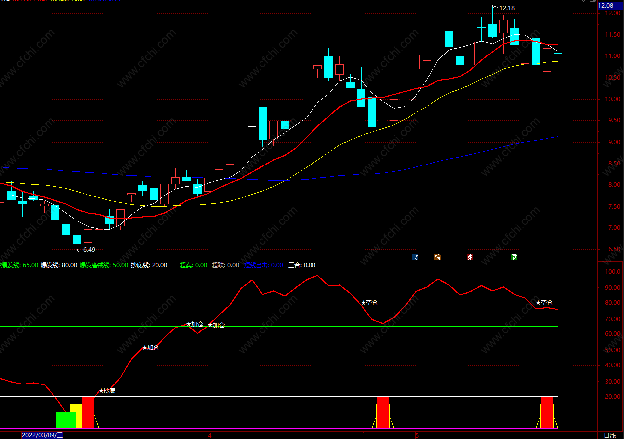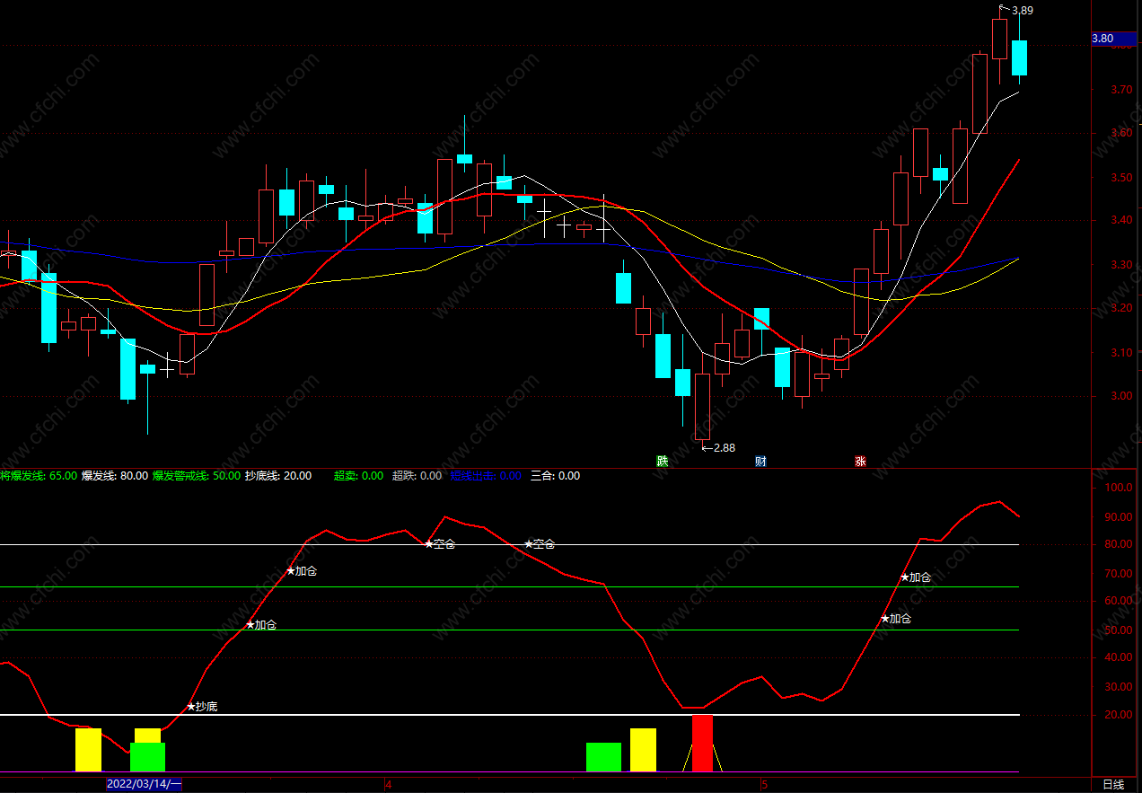 DRAWTEXT(CROSS(主力资金,爆发警戒线),主力资金,'★加仓') ,colorwhite;