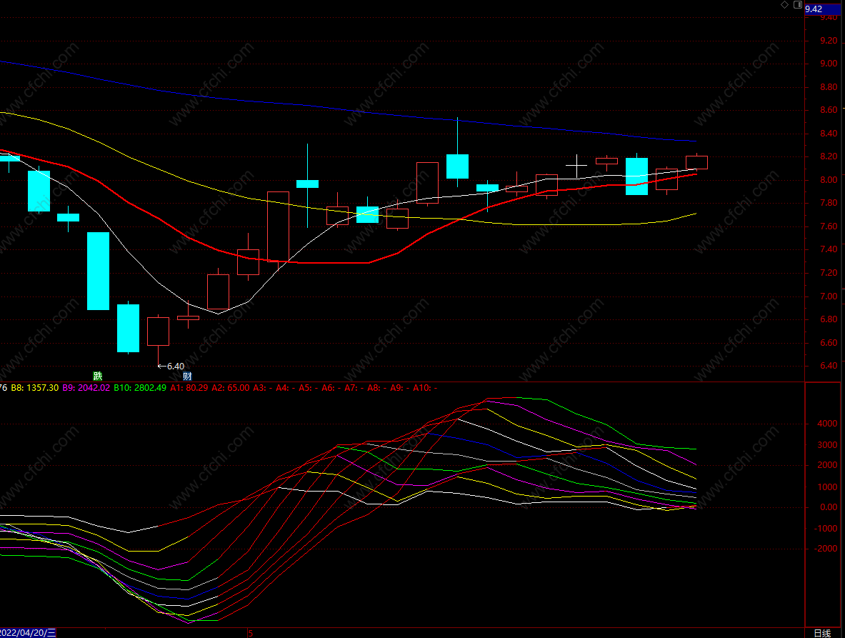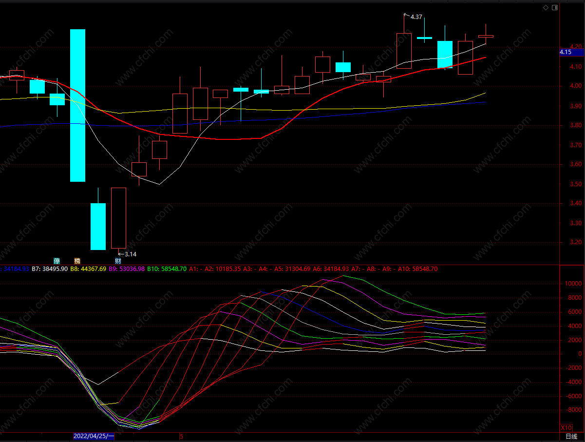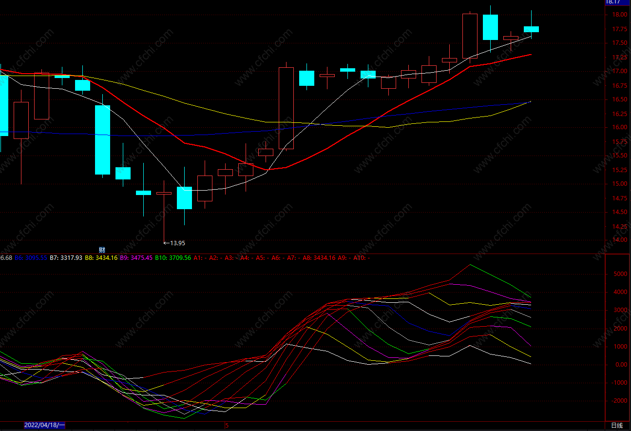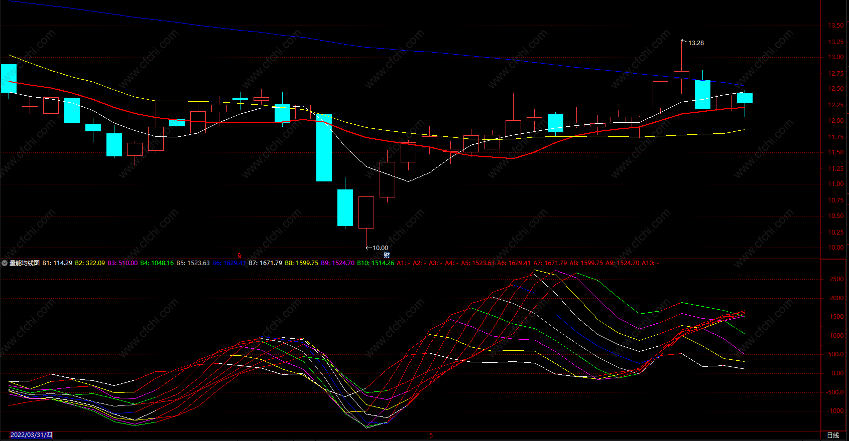 共B1到B10有10条均线。分别从白、绿、蓝等颜色表示,红色代表强度最高。