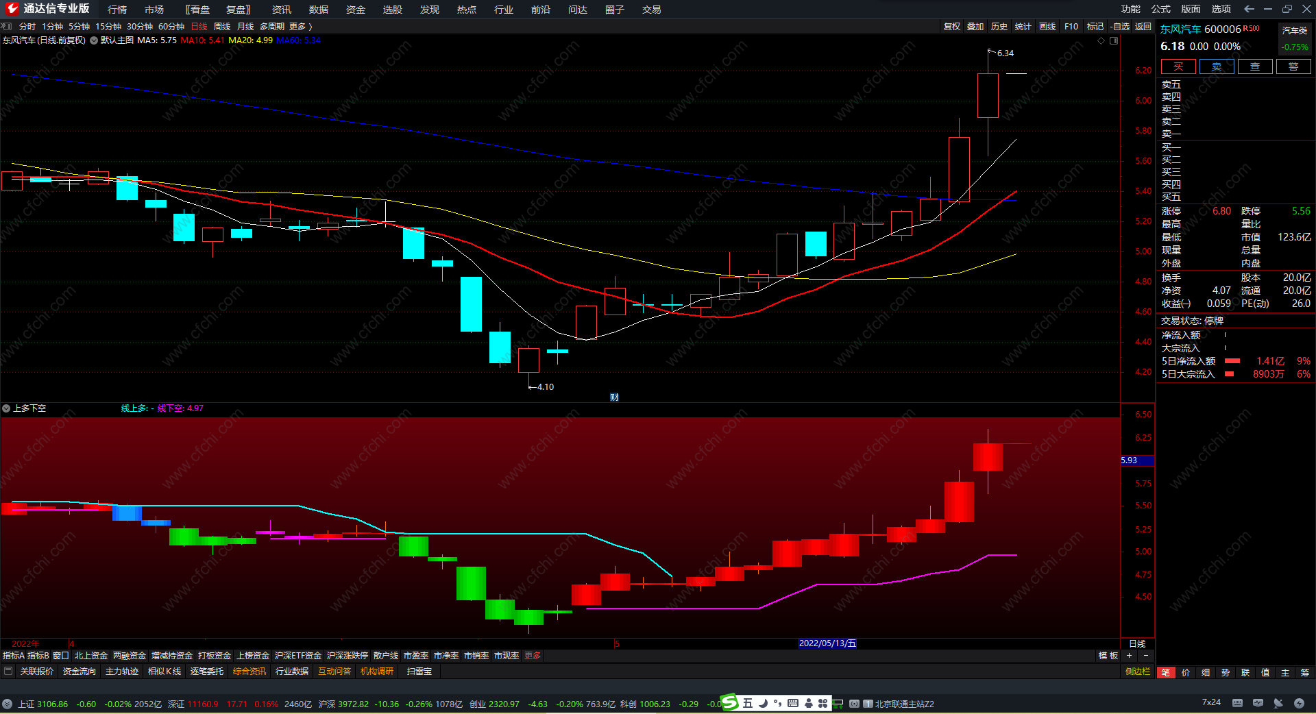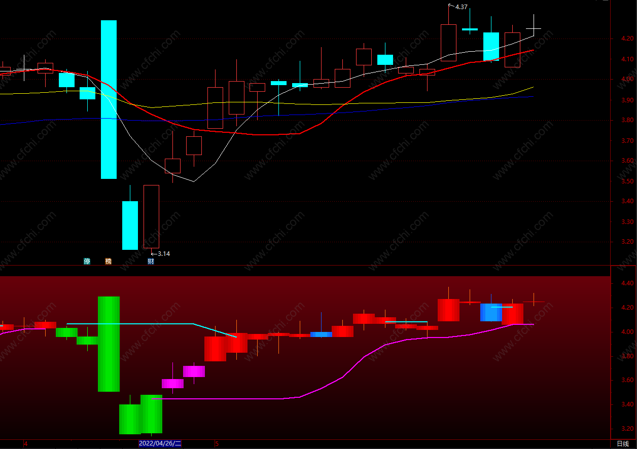 同时K线配以颜色显示,如果红线上且K线也为红色,则为双重信号。