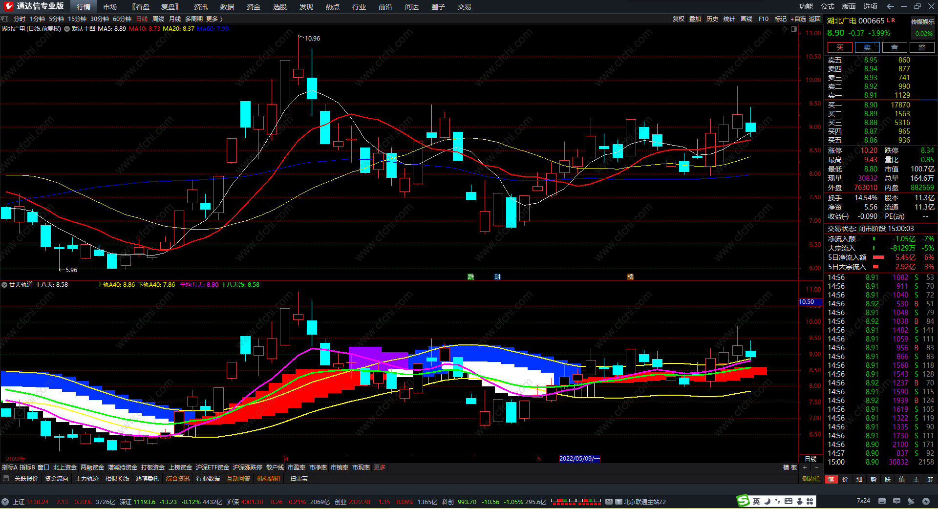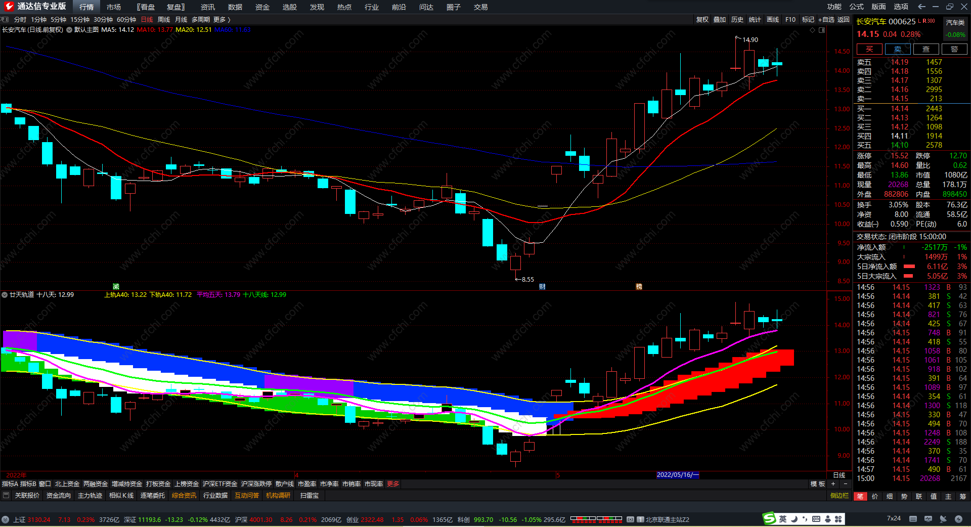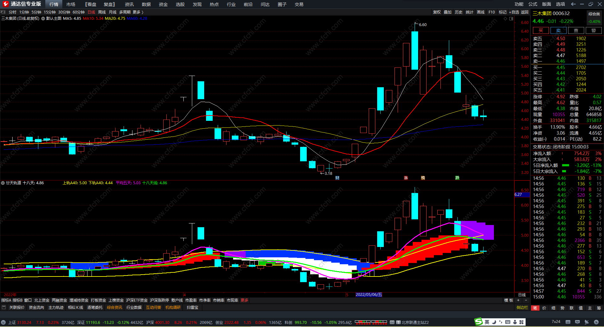 平均五天:(MA(AA,3)+MA(AA,6)+MA(AA,10)+MA(AA,15))/4,colormagenta,LINETHICK3;