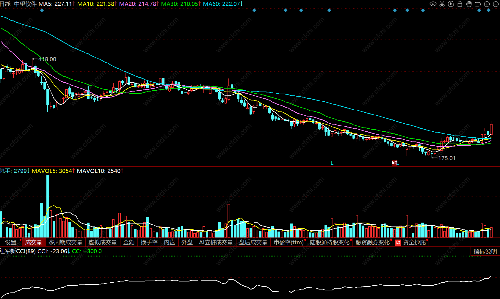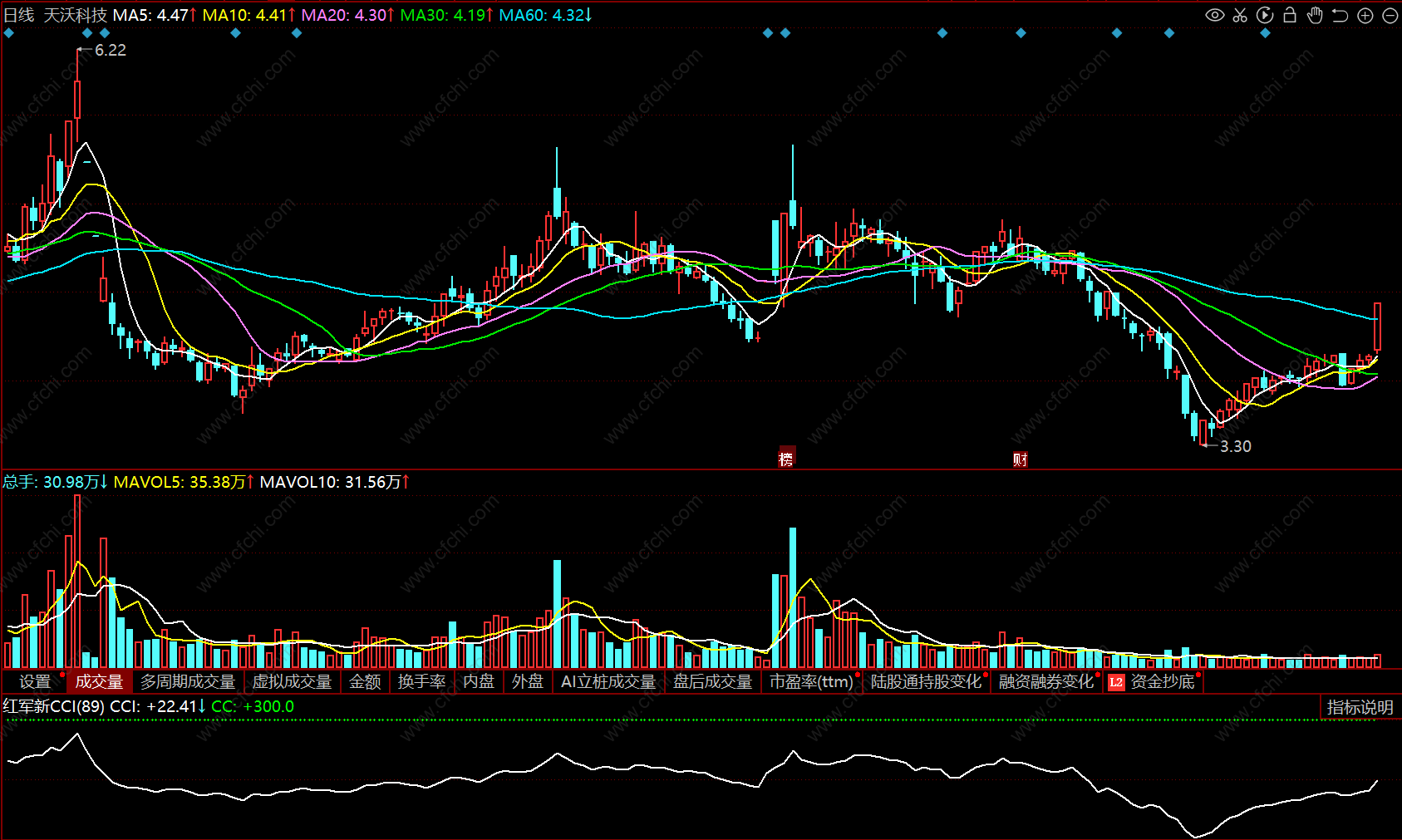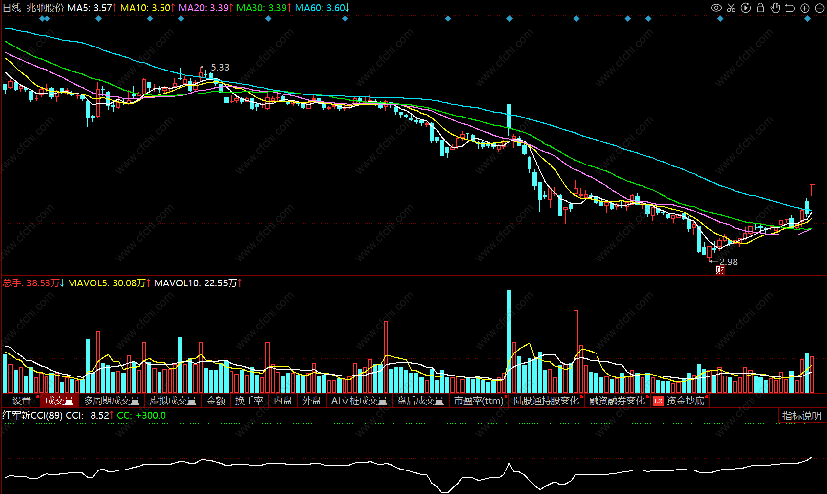 新CCI参数位新参数,新CCI参数上穿300买入参考5日均线上持股或买入,5日均线下不考虑。