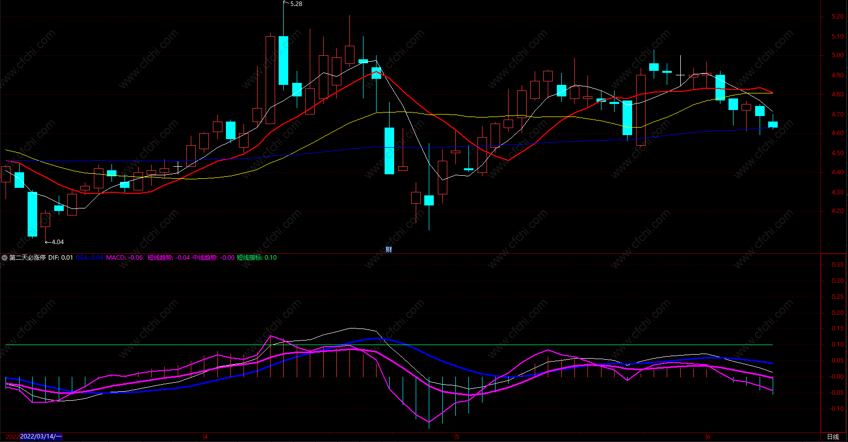 短线趋势:(EMA(CLOSE,5) - EMA(CLOSE,10)),colormagenta,LINETHICK2;
