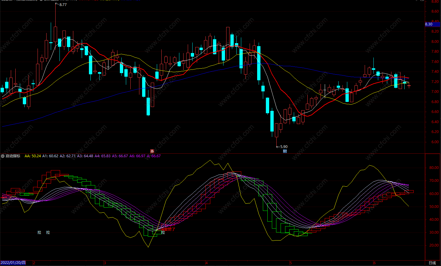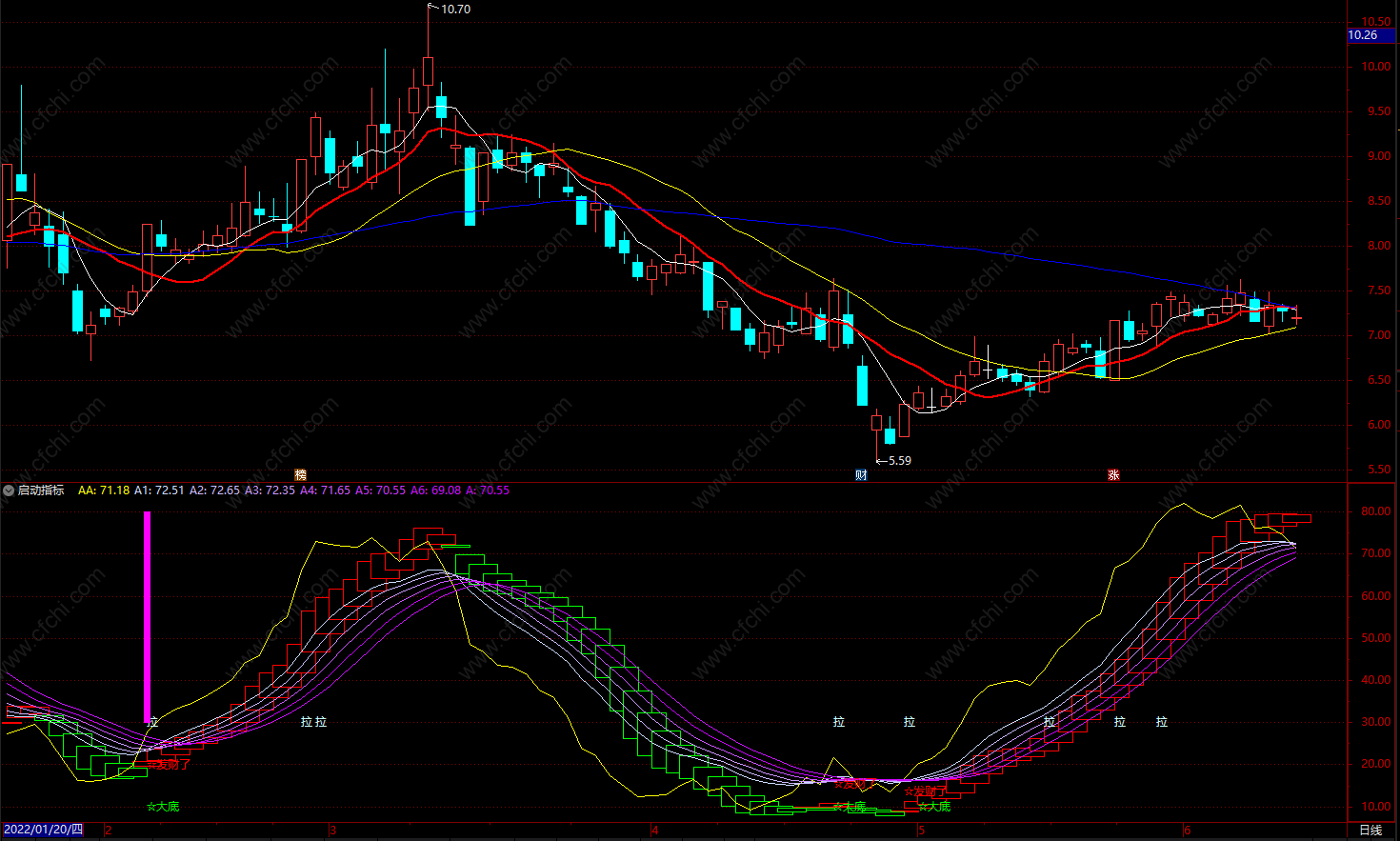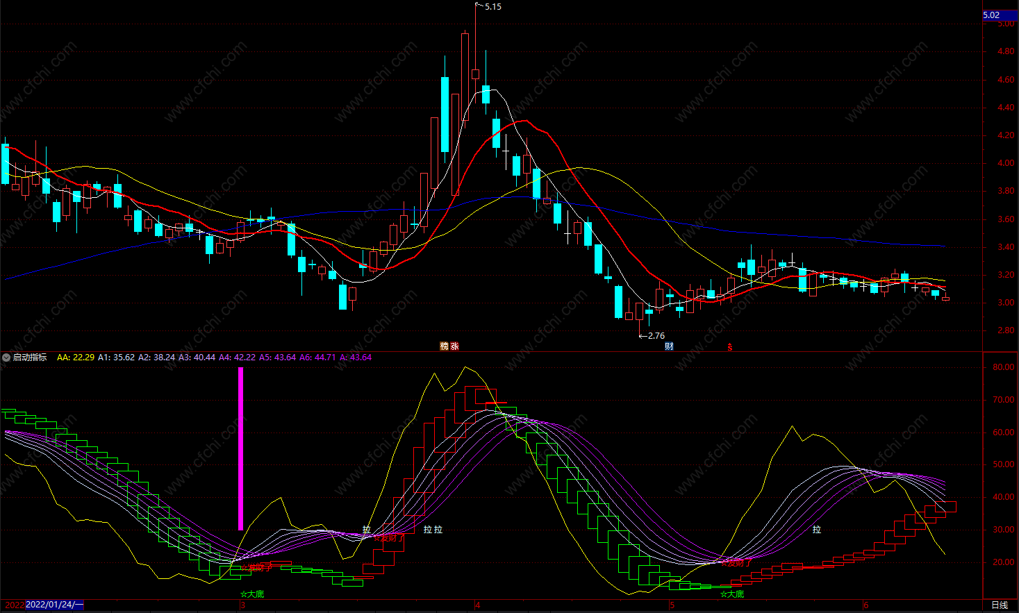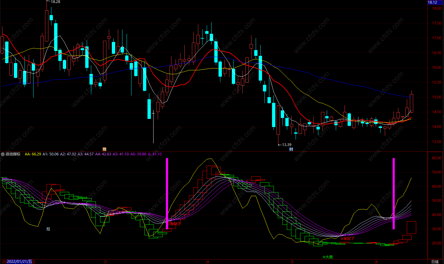 DRAWTEXT(CROSS(AA, A5) AND REF(AA,1)<34,REF(AA,1),'☆发财了'), colorred